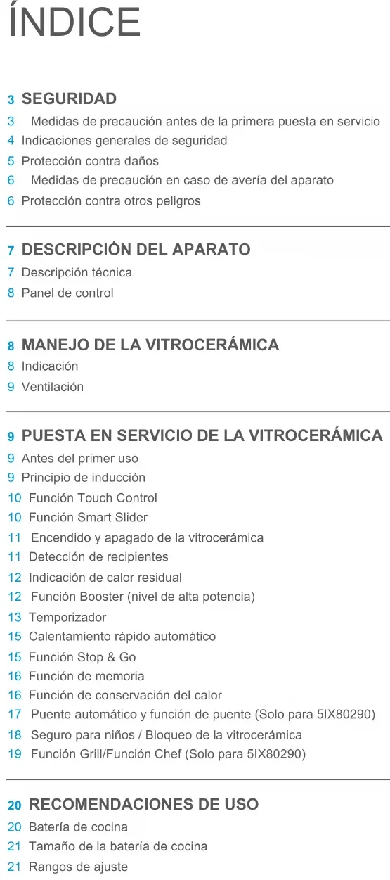 8 Indicación 9 Ventilación 9 PUESTA EN SERVICIO DE LA VITROCERÁMICA 9 Antes del primer uso 9 Principio de inducción 10 Función Touch Control 10 Función Smart Slider 11 Encendido y apagado de la vitrocerámica 11 Detección de recipientes 12 Indicación de calor residual 12 Función Booster (nivel de alta potencia) 13 Temporizador 15 Calentamiento rápido automático 15 Función Stop & Go 16 Función de memoria 16 Función de conservación del calor 17 Puente automático y función de puente (Solo para 5IX80290) 18 Seguro para niños / Bloqueo de la vitrocerámica 19 Función Grill/Función Chef (Solo para 5IX80290)