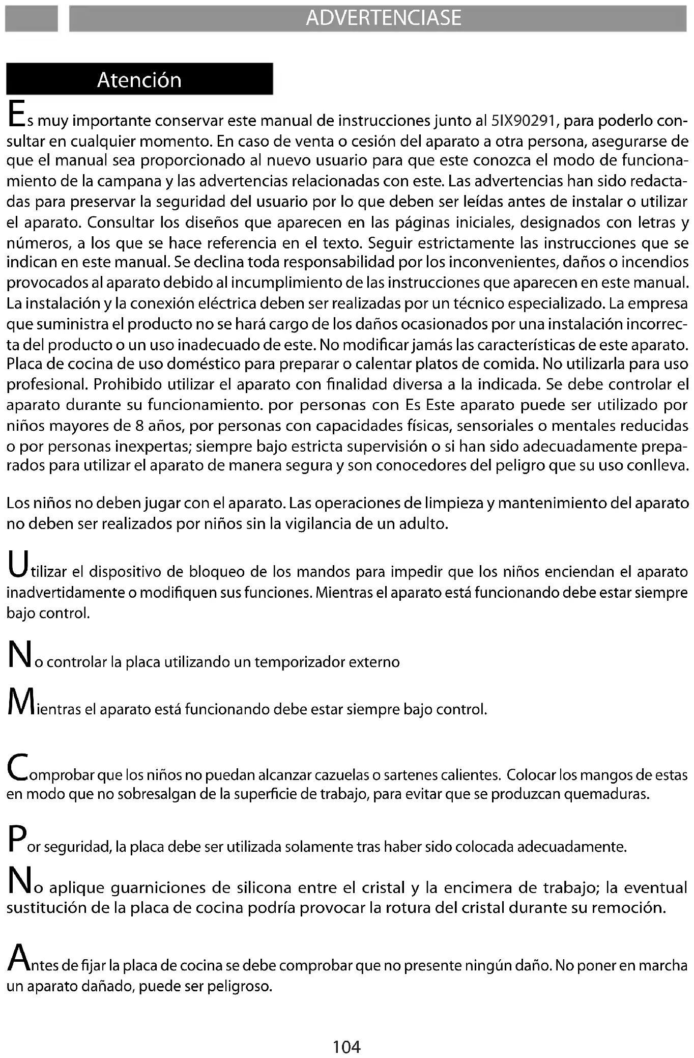 s muy importante conservar este manual de instrucciones junto al 5IX90291, para poderlo con- sultar en cualquier momento. En caso de venta o cesión del aparato a otra persona, asegurarse de que el manual sea proporcionado al nuevo usuario para que este conozca el modo de funciona- miento de la campana y las advertencias relacionadas con este. Las advertencias han sido redacta- das para preservar la seguridad del usuario por lo que deben ser leídas antes de instalar o utilizar el aparato. Consultar los diseños que aparecen en las páginas iniciales, designados con letras y números, a los que se hace referencia en el texto. Seguir estrictamente las instrucciones que se indican en este manual. Se declina toda responsabilidad por los inconvenientes, daños o incendios provocados al aparato debido al incumplimiento de las instrucciones que aparecen en este manual. La instalación y la conexión eléctrica deben ser realizadas por un técnico especializado. La empresa que suministra el producto no se hará cargo de los daños ocasionados por una instalación incorrec- ta del producto o un uso inadecuado de este. No modicar jamás las características de este aparato. Placa de cocina de uso doméstico para preparar o calentar platos de comida. No utilizarla para uso profesional. Prohibido utilizar el aparato con nalidad diversa a la indicada. Se debe controlar el aparato durante su funcionamiento. por personas con Es Este aparato puede ser utilizado por niños mayores de 8 años, por personas con capacidades físicas, sensoriales o mentales reducidas o por personas inexpertas; siempre bajo estricta supervisión o si han sido adecuadamente prepa- rados para utilizar el aparato de manera segura y son conocedores del peligro que su uso conlleva. Los niños no deben jugar con el aparato. Las operaciones de limpieza y mantenimiento del aparato no deben ser realizados por niños sin la vigilancia de un adulto.