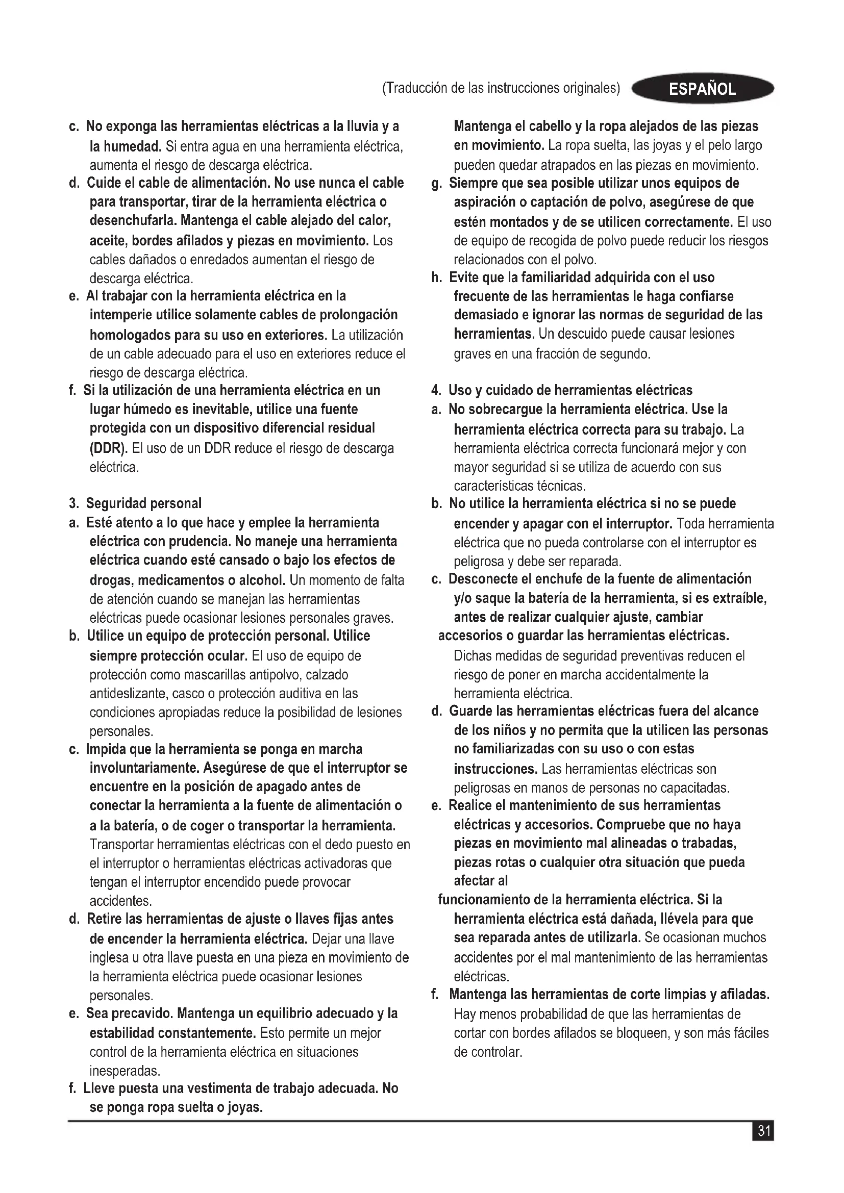 a. No sobrecargue la herramienta eléctrica. Use la herramienta eléctrica correcta para su trabajo. La herramienta eléctrica correcta funcionará mejor y con mayor seguridad si se utiliza de acuerdo con sus características técnicas. b. No utilice la herramienta eléctrica si no se puede encender y apagar con el interruptor. Toda herramienta eléctrica que no pueda controlarse con el interruptor es peligrosa y debe ser reparada. c. Desconecte el enchufe de la fuente de alimentación y/o saque la batería de la herramienta, si es extraíble, antes de realizar cualquier ajuste, cambiar accesorios o guardar las herramientas eléctricas. Dichas medidas de seguridad preventivas reducen el riesgo de poner en marcha accidentalmente la herramienta eléctrica. d. Guarde las herramientas eléctricas fuera del alcance de los niños y no permita que la utilicen las personas no familiarizadas con su uso o con estas instrucciones. Las herramientas eléctricas son peligrosas en manos de personas no capacitadas. e. Realice el mantenimiento de sus herramientas eléctricas y accesorios. Compruebe que no haya piezas en movimiento mal alineadas o trabadas, piezas rotas o cualquier otra situación que pueda afectar al funcionamiento de la herramienta eléctrica. Si la herramienta eléctrica está dañada, llévela para que sea reparada antes de utilizarla. Se ocasionan muchos accidentes por el mal mantenimiento de las herramientas eléctricas. f. Mantenga las herramientas de corte limpias y aladas. Hay menos probabilidad de que las herramientas de cortar con bordes alados se bloqueen, y son más fáciles de controlar.32 (Traducción de las instrucciones originales) ESPAÑOL g. Utilice la herramienta eléctrica, los accesorios, los accesorios de la herramienta, etc., de acuerdo con estas instrucciones, y tenga en cuenta las condiciones de trabajo y la tarea que va a realizar. El uso de la herramienta eléctrica para operaciones que no sean las previstas puede ocasionar una situación peligrosa. h. Mantenga las empuñaduras y supercies de agarre secas, limpias y libres de aceite y grasa. Las empuñaduras resbaladizas y las supercies engrasadas impiden aferrar y controlar la herramienta en situaciones imprevistas.