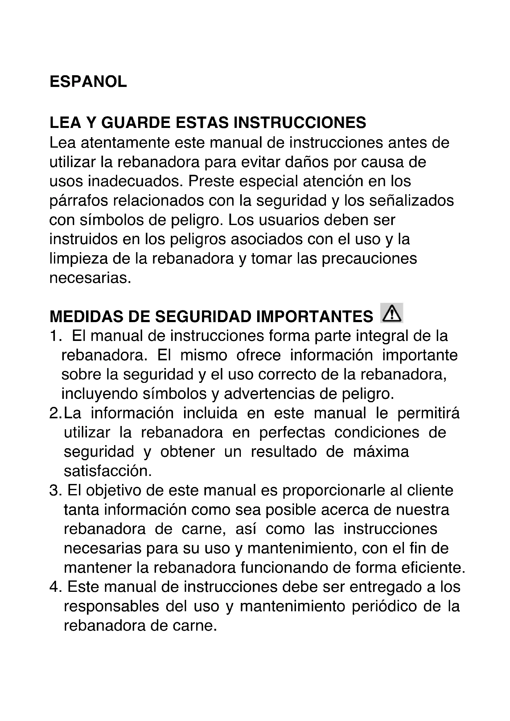 Lea atentamente este manual de instrucciones antes de utilizar la rebanadora para evitar daños por causa de usos inadecuados. Preste especial atención en los párrafos relacionados con la seguridad y los señalizados con símbolos de peligro. Los usuarios deben ser instruidos en los peligros asociados con el uso y la limpieza de la rebanadora y tomar las precauciones necesarias.