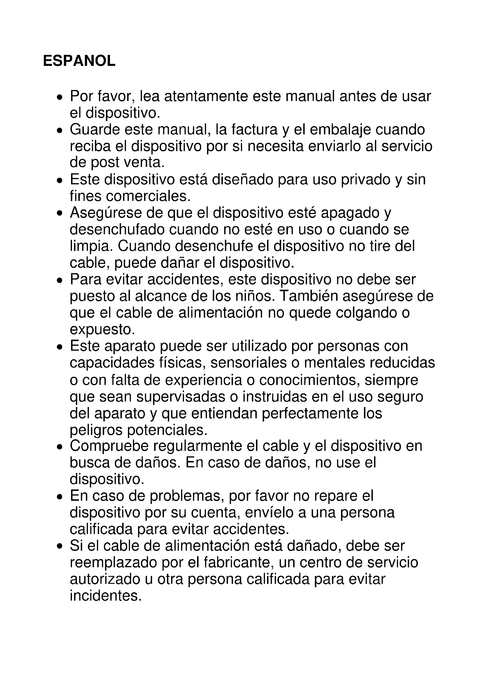 Mantenga el aparato y su cable eléctrico fuera del alcance de niños de menos de 8 años.• El dispositivo no debe utilizarse si se ha caído, si hay signos evidentes de daño o si hay fugas.