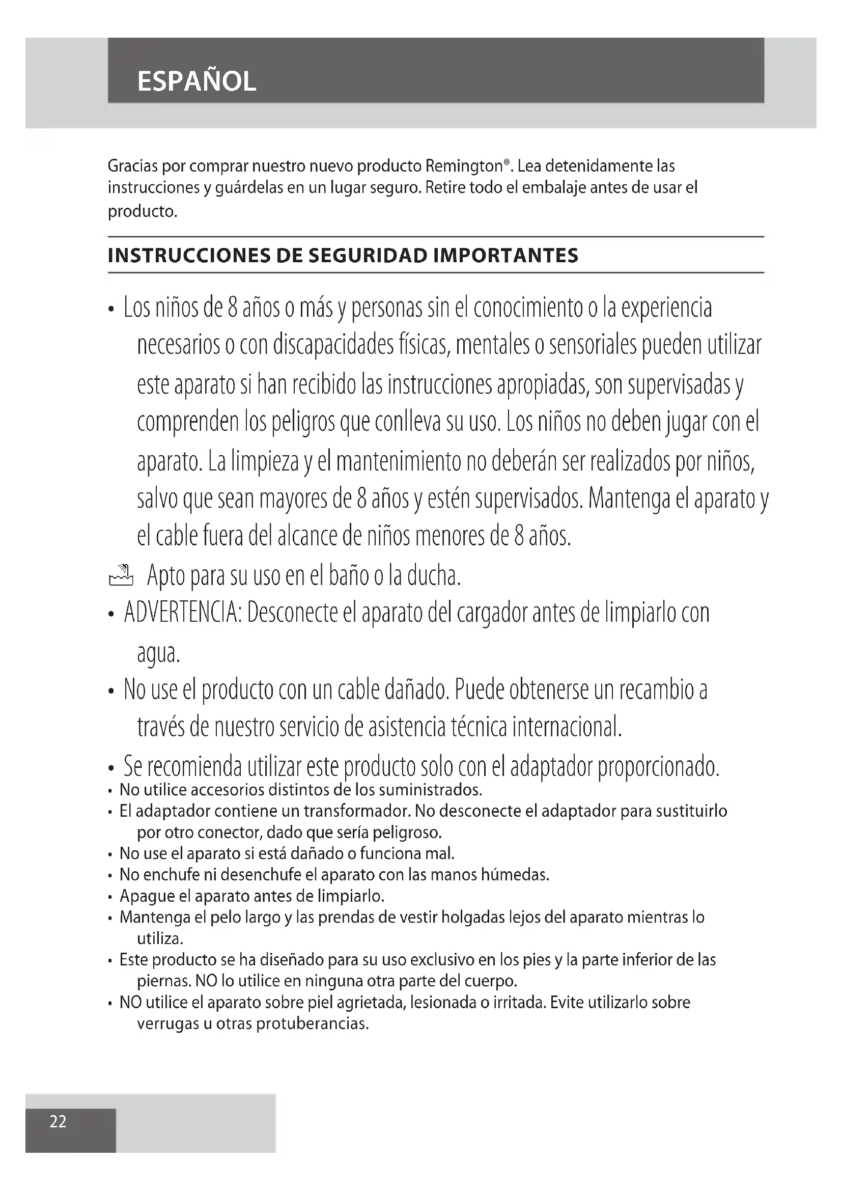 AE22 Gracias por comprar nuestro nuevo producto Remington®. Lea detenidamente las instrucciones y guárdelas en un lugar seguro. Retire todo el embalaje antes de usar el producto.