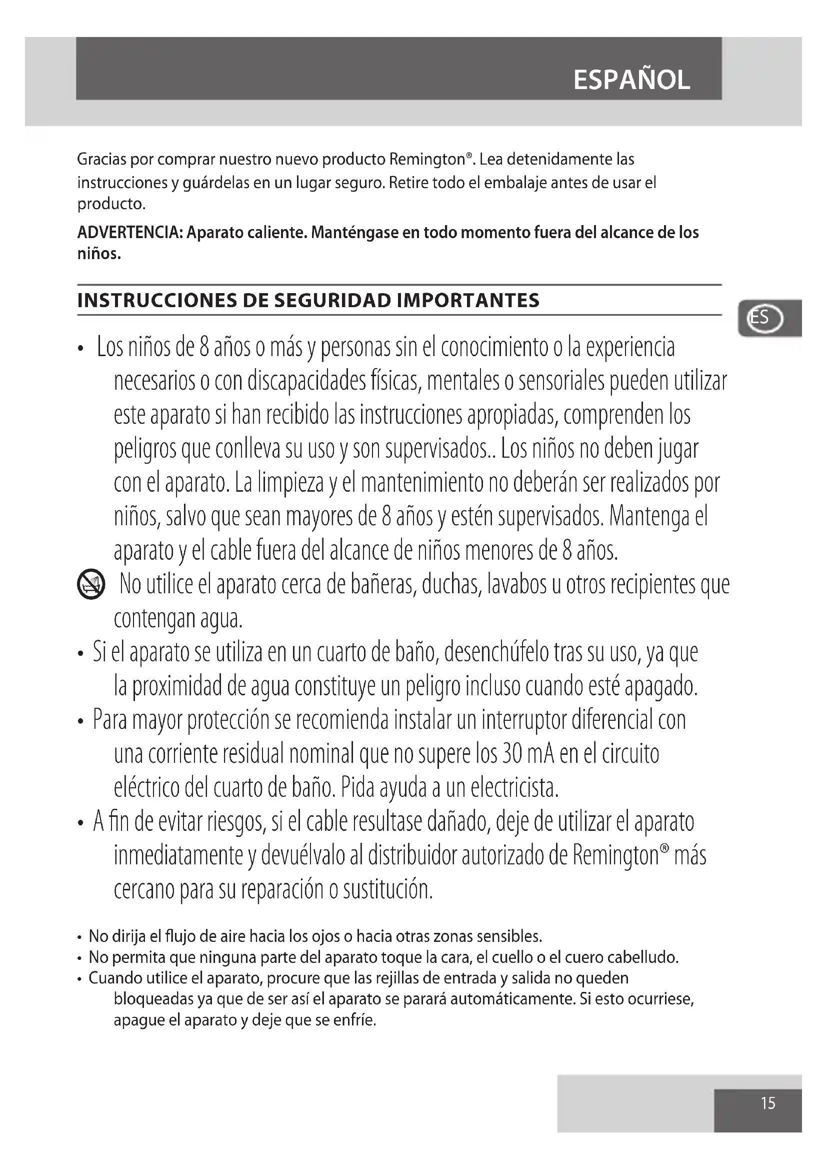 - A fin de evaporar riesgos, si el cable resultase dañado,cede de utiliser el aparato inmediamente y devuelvalo al distribuidor autorizado de Remington® más cercano para su reparación o sustitución.