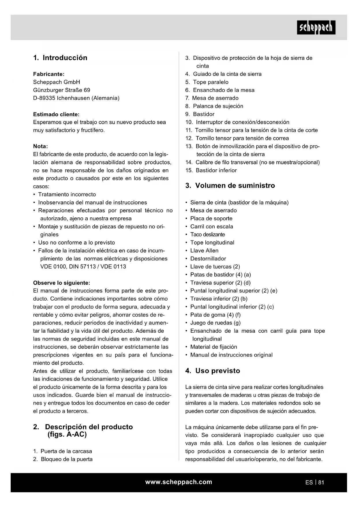 Fabricante: Scheppach GmbH Günzburger Straße 69 D-89335 Ichenhausen (Alemania) Estimado cliente: Esperamos que el trabajo con su nuevo producto sea muy satisfactorio y fructífero. Nota: El fabricante de este producto, de acuerdo con la legis- lación alemana de responsabilidad sobre productos, no se hace responsable de los daños originados en este producto o causados por este en los siguientes casos: