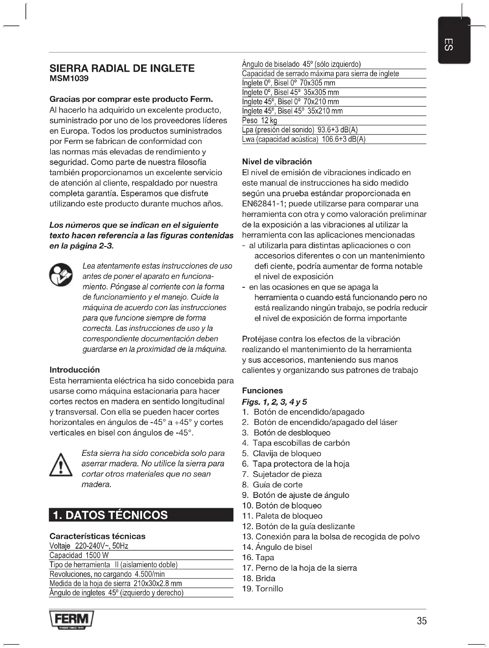 MSM1039 Gracias por comprar este producto Ferm. Al hacerlo ha adquirido un excelente producto, suministrado por uno de los proveedores líderes en Europa. Todos los productos suministrados por Ferm se fabrican de conformidad con las normas más elevadas de rendimiento y seguridad. Como parte de nuestra filosofía también proporcionamos un excelente servicio de atención al cliente, respaldado por nuestra completa garantía. Esperamos que disfrute utilizando este producto durante muchos años. Los números que se indican en el siguiente texto hacen referencia a las figuras contenidas en la página 2-3. Lea atentamente estas instrucciones de uso antes de poner el aparato en funciona- miento. Póngase al corriente con la forma de funcionamiento y el manejo. Cuide la máquina de acuerdo con las instrucciones para que funcione siempre de forma correcta. Las instrucciones de uso y la correspondiente documentación deben guardarse en la proximidad de la máquina. Introducción Esta herramienta eléctrica ha sido concebida para usarse como máquina estacionaria para hacer cortes rectos en madera en sentido longitudinal y transversal. Con ella se pueden hacer cortes horizontales en ángulos de -45° a +45° y cortes verticales en bisel con ángulos de -45°. Esta sierra ha sido concebida solo para aserrar madera. No utilice la sierra para cortar otros materiales que no sean madera.