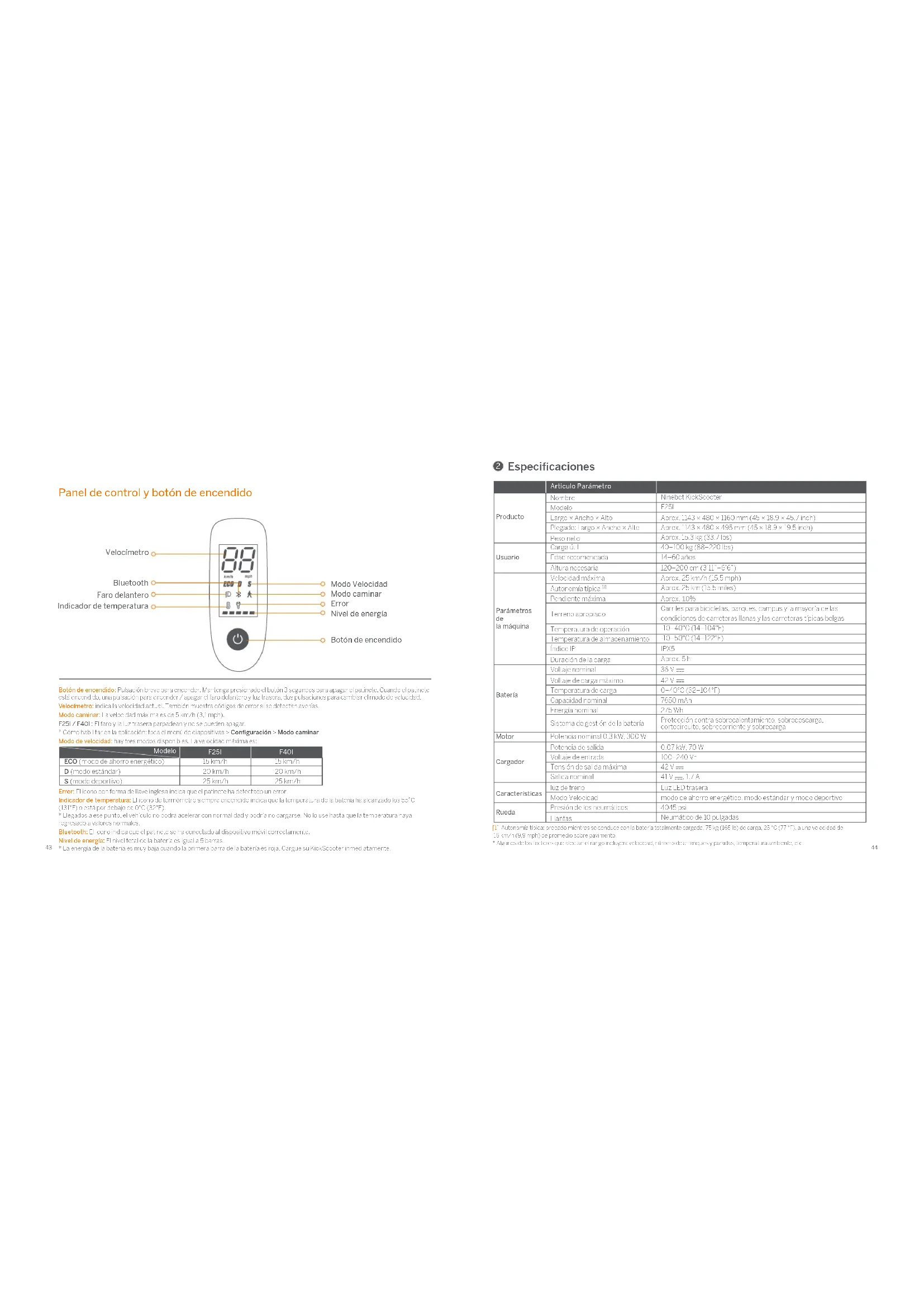 367 Wh Protección contra sobrecalentamiento, sobredescarga, cortocircuito, sobrecorriente y sobrecarga 40–120 kg (88–265 lbs) 14–60 años 120–200 cm (3’11”–6’6”) [1] Autonomía típica: probado mientras se conduce con la batería totalmente cargada, 75 kg (165 lb) de carga, 25 °C (77 °F), a una velocidad de 16 km/h (9,9 mph) de promedio sobre pavimento.