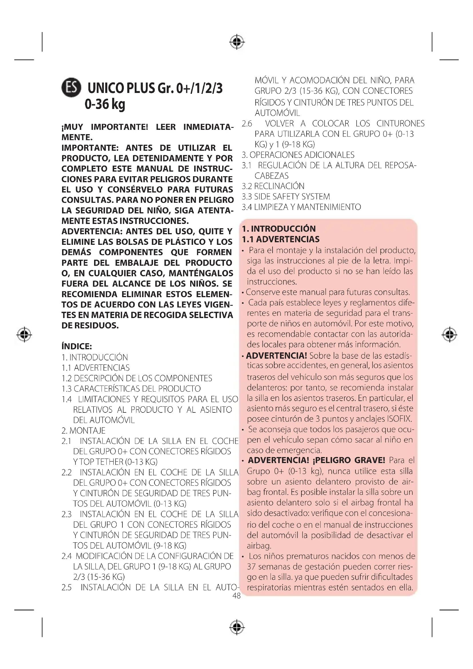 - ADVERTENCIA! ¡PELIGRO GRAVE! Para el Grupo 0+ (0-13 kg), nunca utilice esta silla sobre un asiento delantero provisto de air- bag frontal. Es posible instalar la silla sobre un asiento delantero solo si el airbag frontal ha sido desactivado: verique con el concesiona- rio del coche o en el manual de instrucciones del automóvil la posibilidad de desactivar el airbag.