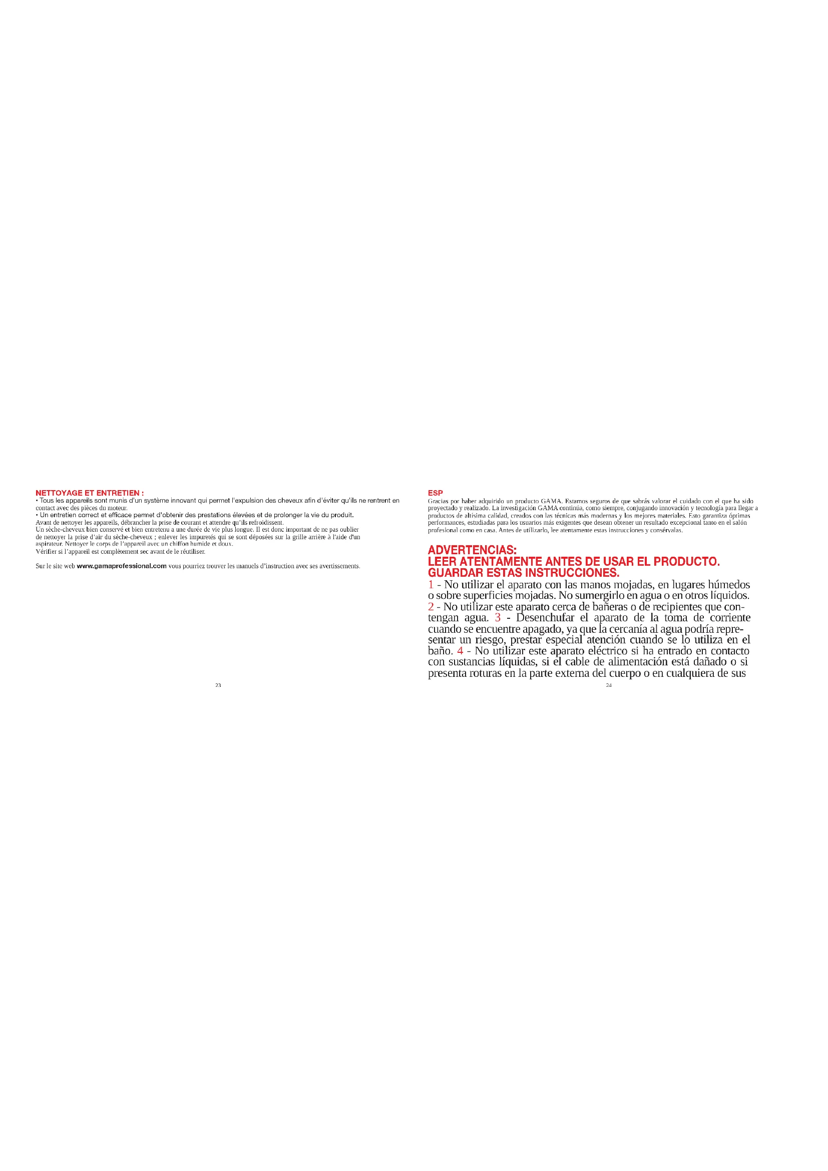 ESP Gracias por haber adquirido un producto GAMA. Estamos seguros de que sabrás valorar el cuidado con el que ha sido proyectado y realizado. La investigación GAMA continúa, como siempre, conjugando innovación y tecnología para llegar a productos de altísima calidad, creados con las técnicas más modernas y los mejores materiales. Esto garantiza óptimas performances, estudiadas para los usuarios más exigentes que desean obtener un resultado excepcional tanto en el salón profesional como en casa. Antes de utilizarlo, lee atentamente estas instrucciones y consérvalas. ADVERTENCIAS: LEER ATENTAMENTE ANTES DE USAR EL PRODUCTO. GUARDAR ESTAS INSTRUCCIONES.