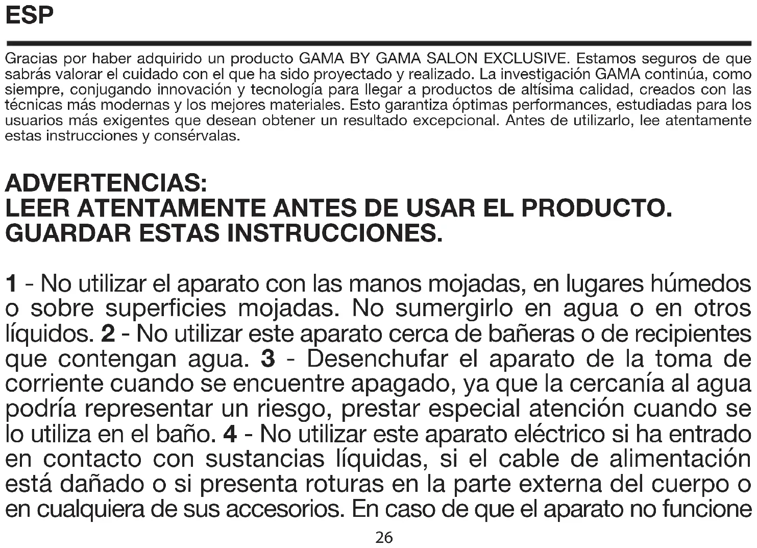 o sobre superficies mojadas. No sumergirlo en agua o en otros líquidos. 2 - No utilizar este aparato cerca de bañeras o de recipientes que contengan agua. 3 - Desenchufar el aparato de la toma de corriente cuando se encuentre apagado, ya que la cercanía al agua podría representar un riesgo, prestar especial atención cuando se lo utiliza en el baño. 4 - No utilizar este aparato eléctrico si ha entrado en contacto con sustancias líquidas, si el cable de alimentación está dañado o si presenta roturas en la parte externa del cuerpo o en cualquiera de sus accesorios. En caso de que el aparato no funcione 26correctamente, desenchufarlo inmediatamente de la toma de corriente y dirigirse a un centro técnico para su control. 5 - Para evitar cualquier tipo de riesgo en el caso que el cable de alimentación esté dañado, pedir inmediatamente el cambio del cable al fabricante o dirigirse a un centro de reparación autorizado o a personal cualificado.