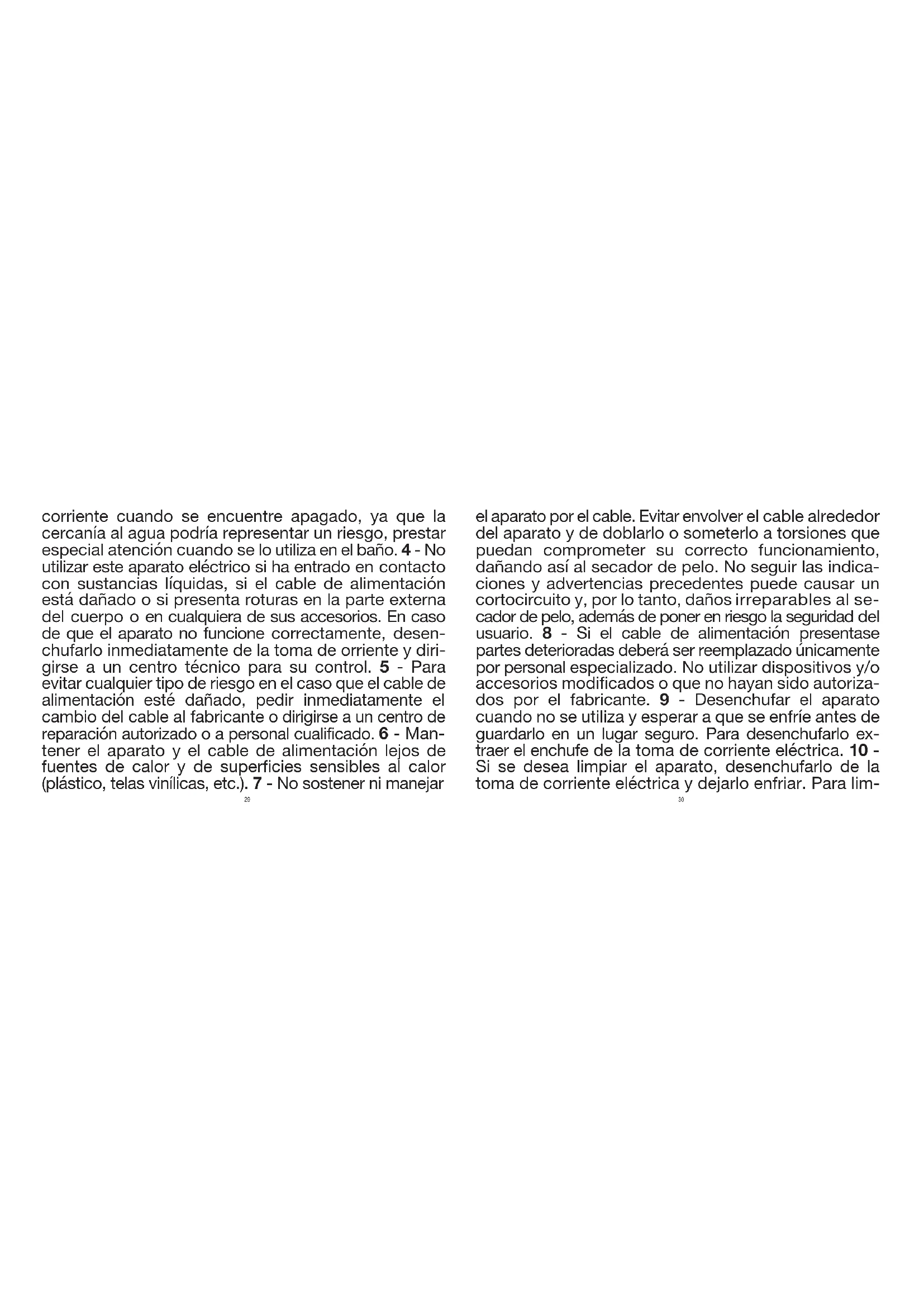 28corriente cuando se encuentre apagado, ya que la cercanía al agua podría representar un riesgo, prestar especial atención cuando se lo utiliza en el baño. 4 - No utilizar este aparato eléctrico si ha entrado en contacto con sustancias líquidas, si el cable de alimentación está dañado o si presenta roturas en la parte externa del cuerpo o en cualquiera de sus accesorios. En caso de que el aparato no funcione correctamente, desen- chufarlo inmediatamente de la toma de orriente y diri- girse a un centro técnico para su control. 5 - Para evitar cualquier tipo de riesgo en el caso que el cable de alimentación esté dañado, pedir inmediatamente el cambio del cable al fabricante o dirigirse a un centro de reparación autorizado o a personal cualificado.