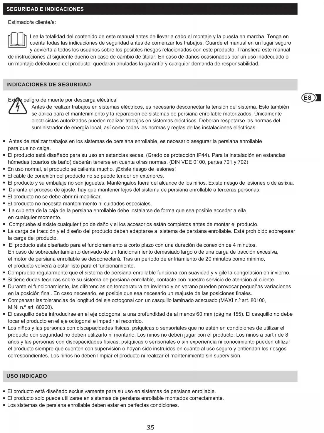 ¡Existe peligro de muerte por descarga eléctrica! Antes de realizar trabajos en sistemas eléctricos, es necesario desconectar la tensión del sistema. Esto también se aplica para el mantenimiento y la reparación de sistemas de persiana enrollable motorizados. Únicamente electricistas autorizados pueden realizar trabajos en sistemas eléctricos. Deberán respetarse las normas del suministrador de energía local, así como todas las normas y reglas de las instalaciones eléctricas. Antes de realizar trabajos en los sistemas de persiana enrollable, es necesario asegurar la persiana enrollable para que no caiga. El producto está diseñado para su uso en estancias secas. (Grado de protección IP44). Para la instalación en estancias húmedas (cuartos de baño) deberán tenerse en cuenta otras normas. (DIN VDE 0100, partes 701 y 702) En uso normal, el producto se calienta mucho. ¡Existe riesgo de lesiones! El cable de conexión del producto no se puede tender en exteriores. El producto y su embalaje no son juguetes. Manténgalos fuera del alcance de los niños. Existe riesgo de lesiones o de asxia. Durante el proceso de ajuste, hay que mantener lejos del sistema de persiana enrollable a terceras personas. El producto no se debe abrir ni modicar. El producto no necesita mantenimiento ni cuidados especiales. La cubierta de la caja de la persiana enrollable debe instalarse de forma que sea posible acceder a ella en cualquier momento. Compruebe si existe cualquier tipo de daño y si los accesorios están completos antes de montar el producto. La carga de tracción y el diseño del producto deben adaptarse al sistema de persiana enrollable. Está prohibido sobrepasar la carga del producto. El producto está diseñado para el funcionamiento a corto plazo con una duración de conexión de 4 minutos. En caso de sobrecalentamiento derivado de un funcionamiento demasiado largo o de una carga de tracción excesiva, el motor de persiana enrollable se desconectará. Tras un periodo de enfriamiento de 20 minutos como mínimo, el producto volverá a estar listo para el funcionamiento. Compruebe regularmente que el sistema de persiana enrollable funciona con suavidad y vigile la congelación en invierno. Si tiene dudas técnicas sobre su sistema de persiana enrollable, contacte con nuestro servicio de atención al cliente. Durante el funcionamiento, las diferencias de temperatura en invierno y en verano pueden provocar pequeñas variaciones en la posición nal. En caso necesario, es posible que sea necesario un reajuste de las posiciones nales. Compensar las tolerancias de longitud del eje octogonal con un casquillo laminado adecuado (MAXI n.º art. 80100, MINI n.º art. 80200). El casquillo debe introducirse en el eje octogonal a una profundidad de al menos 60 mm (página 155). El casquillo no debe tocar el producto en el eje octogonal e impedir el recorrido. Los niños y las personas con discapacidades físicas, psíquicas o sensoriales que no estén en condiciones de utilizar el producto con seguridad no deben utilizarlo ni montarlo. Los niños no deben jugar con el producto. Los niños a partir de 8 años y las personas con discapacidades físicas, psíquicas o sensoriales o sin experiencia ni conocimiento pueden utilizar el producto siempre que cuenten con supervisión o hayan sido instruidos en cuanto al uso seguro y entiendan los riesgos correspondientes. Los niños no deben limpiar el producto ni realizar el mantenimiento sin supervisión. USO INDICADO El producto está diseñado exclusivamente para su uso en sistemas de persiana enrollable. El producto solo puede utilizarse en sistemas de persiana enrollable montados correctamente. Los sistemas de persiana enrollable deben estar en perfectas condiciones.36 Directiva de máquinas 2006/42/CE Directiva de equipos radioeléctricos 2014/53/UE Directiva 2014/42/UE sobre compatibilidad electromagnética Directiva RAEE 2011/65/UE Se deben reparar los desperfectos en los sistemas de persiana enrollable y sustituir las piezas dañadas antes de montar el producto. Cualquier uso del producto distinto o ajeno al descrito se considerará uso no indicado. La persiana enrollable debe estar asegurada contra desplazamiento lateral. (colgadura de la persiana enrollable según DIN EN 13695, EN 12045) Alfred Schellenberg GmbH no se hace responsable de los daños personales, materiales o indirectos que se deriven de un uso no indicado. El producto solo debe ponerse en funcionamiento con los emisores inalámbricos autorizados por Schellenberg.