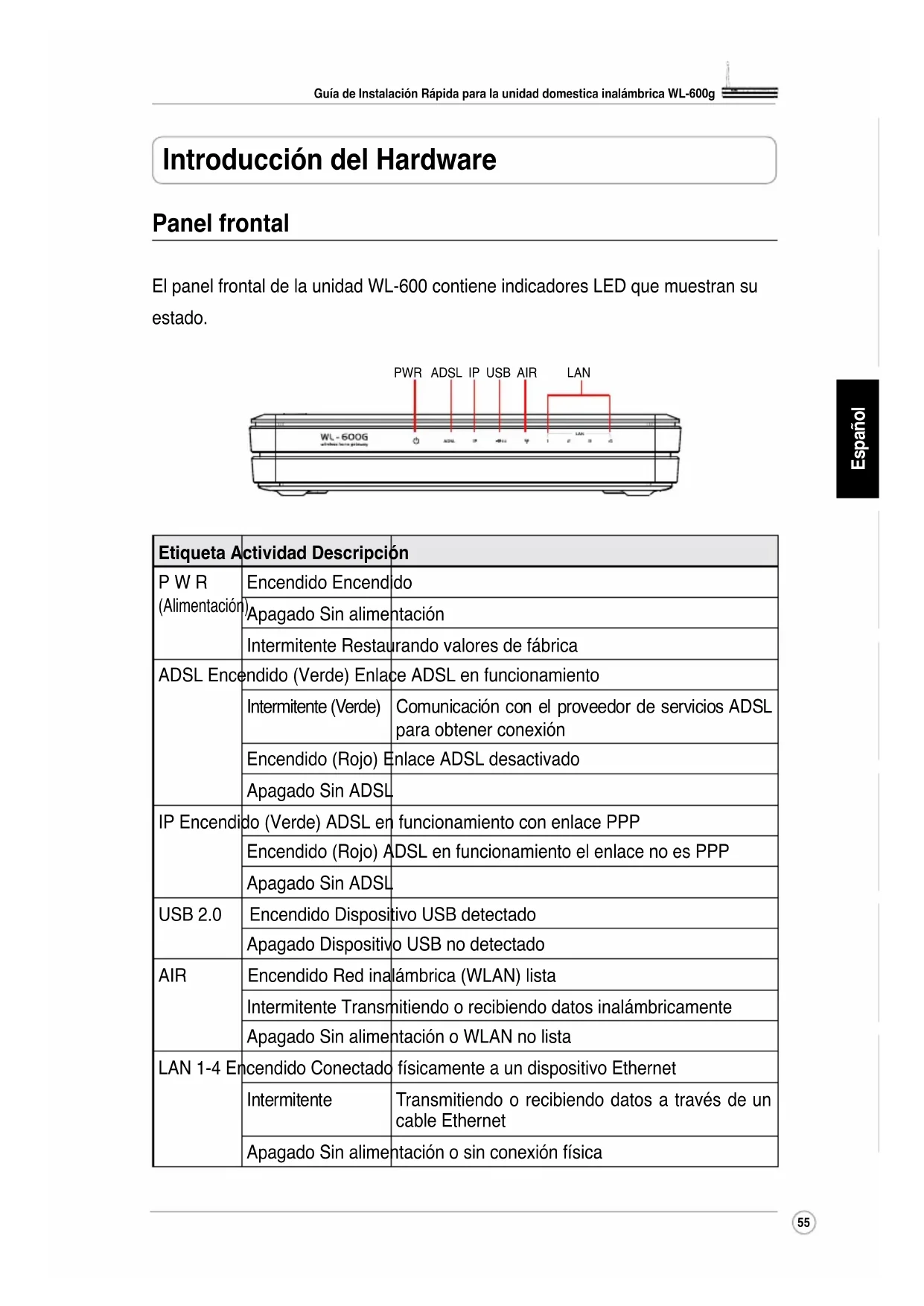 RomânăItalianoPortuguêsFrançais Introducción del Hardware Panel frontal El panel frontal de la unidad WL-600 contiene indicadores LED que muestran su estado. Etiqueta Actividad Descripción P W R (Alimentación) Encendido Encendido Apagado Sin alimentación Intermitente Restaurando valores de fábrica ADSL Encendido (Verde) Enlace ADSL en funcionamiento Intermitente (Verde) Comunicación con el proveedor de servicios ADSL para obtener conexión Encendido (Rojo) Enlace ADSL desactivado Apagado Sin ADSL IP Encendido (Verde) ADSL en funcionamiento con enlace PPP Encendido (Rojo) ADSL en funcionamiento el enlace no es PPP Apagado Sin ADSL USB 2.0 Encendido Dispositivo USB detectado Apagado Dispositivo USB no detectado AIR Encendido Red inalámbrica (WLAN) lista Intermitente Transmitiendo o recibiendo datos inalámbricamente Apagado Sin alimentación o WLAN no lista LAN 1-4 Encendido Conectado físicamente a un dispositivo Ethernet Intermitente Transmitiendo o recibiendo datos a través de un cable Ethernet Apagado Sin alimentación o sin conexión física PWR ADSL IP USB AIR LANGuía de Instalación Rápida para la unidad domestica inalámbrica WL-600g