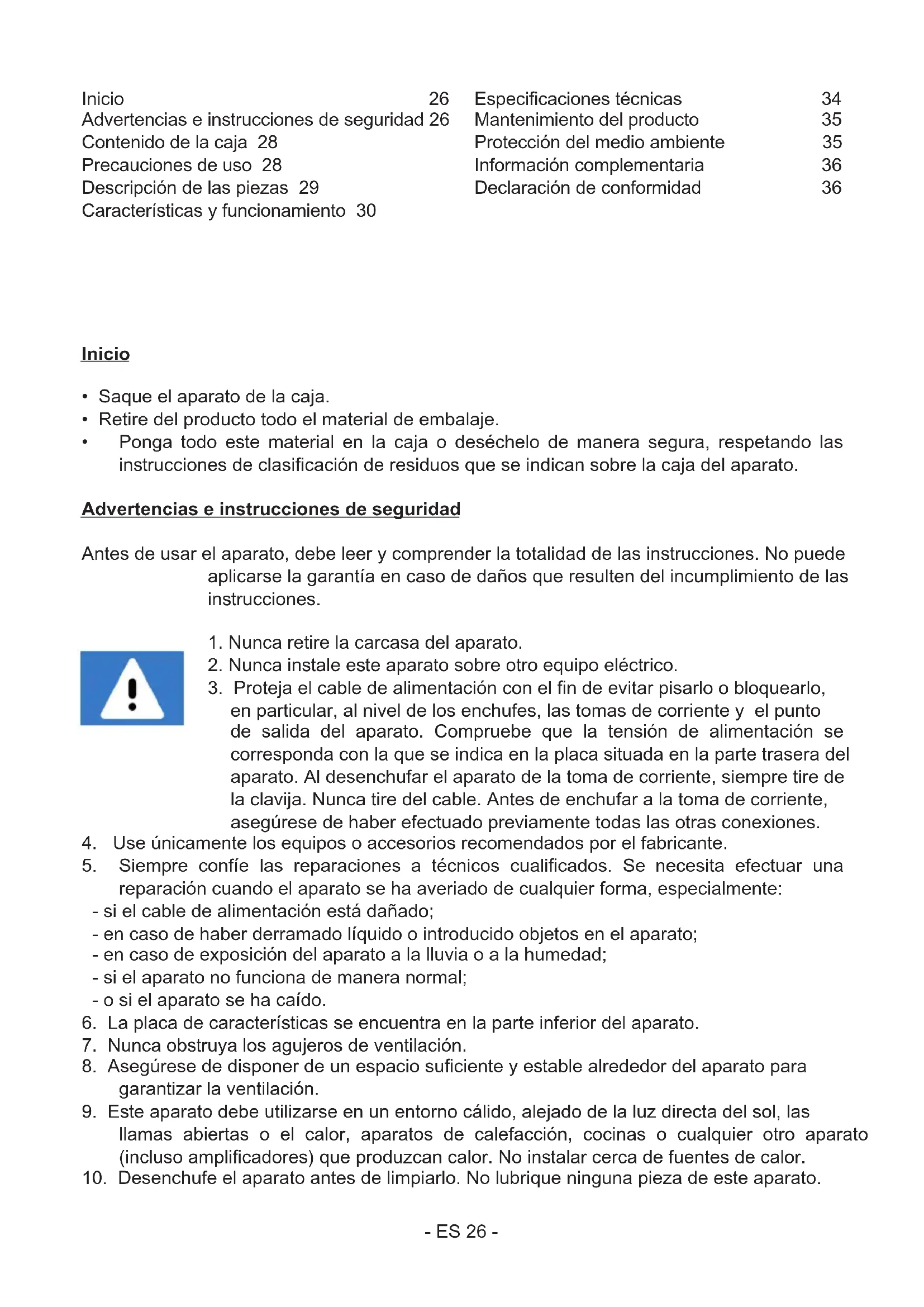 Inicio 26 Advertencias e inrucciones de seguridad 26 Contenido de la caja 28 Precauciones de uso 28 Descripción de las piezas 29 Caracteríicas y funcionamiento 30 Especicaciones técnicas 34 Mantenimiento del producto 35 Protección del medio ambiente 35 Información complementaria 36 Declaración de conformidad 36- ES 27 - Límpielo con un paño suave. No use productos abrasivos ni limpiadores agresivos.