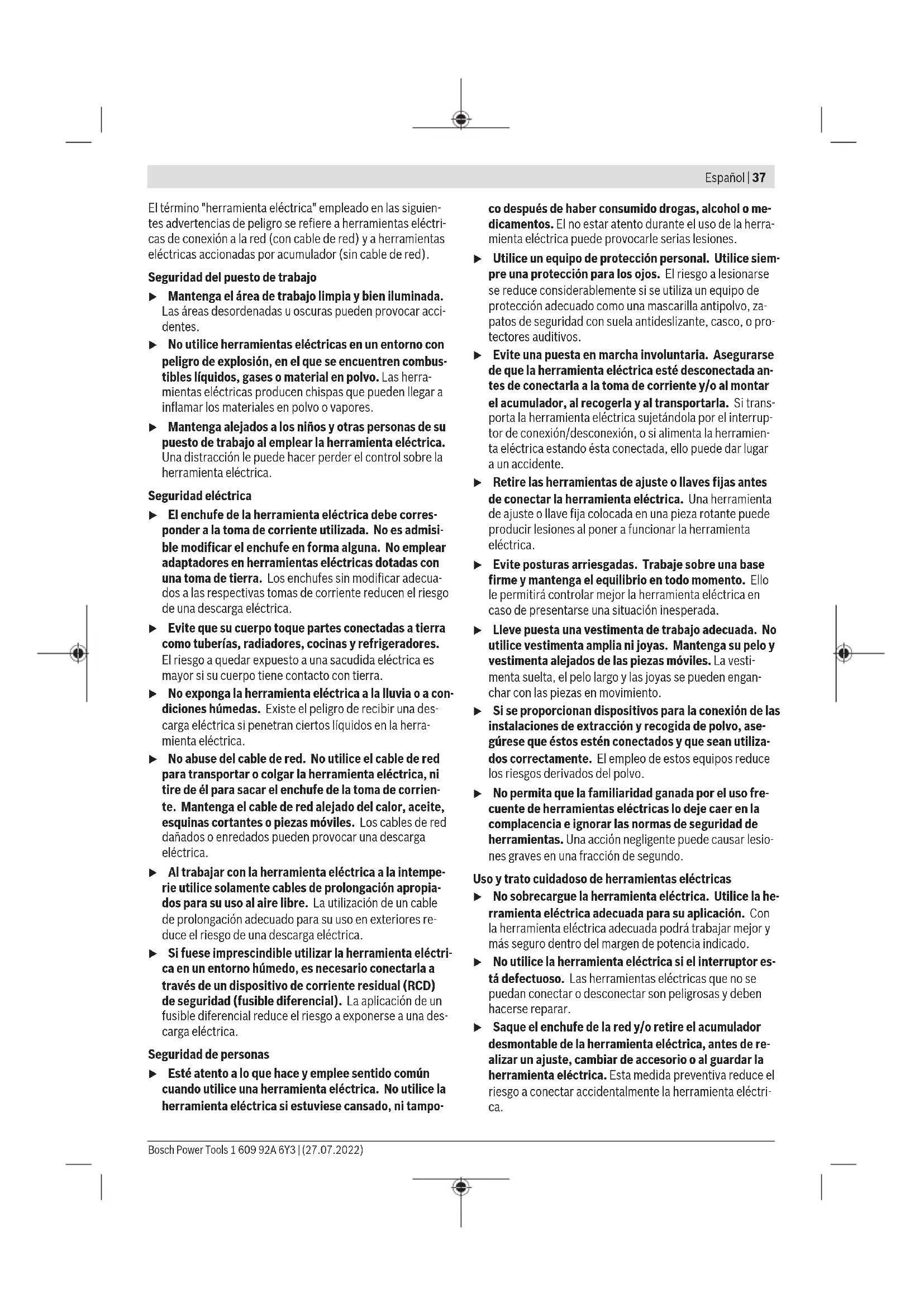 1,5 1,5 El nivel de vibraciones y el valor de emisiones de ruidos indi- cados en estas instrucciones han sido determinados según un procedimiento de medición normalizado y pueden servir como base de comparación con otras herramientas eléctri- cas. También son adecuados para estimar provisionalmente la emisión de vibraciones y ruidos. El nivel de vibraciones y el valor de emisiones de ruidos indi- cados han sido determinados para las aplicaciones principa- les de la herramienta eléctrica. Por ello, el nivel de vibracio- nes y el valor de emisiones de ruidos pueden ser diferentes si la herramienta eléctrica se utiliza para otras aplicaciones, con útiles diferentes, o si el mantenimiento de la misma fue- se deficiente. Ello puede suponer un aumento drástico de la emisión de vibraciones y de ruidos durante el tiempo total de trabajo. Para determinar con exactitud las emisiones de vibraciones y de ruidos, es necesario considerar también aquellos tiem- pos en los que el aparato esté desconectado, o bien, esté en funcionamiento, pero sin ser utilizado realmente. Ello puede suponer una disminución drástica de las emisiones de vibra- ciones y de ruidos durante el tiempo total de trabajo. Fije unas medidas de seguridad adicionales para proteger al usuario de los efectos por vibraciones, como por ejemplo: Mantenimiento de la herramienta eléctrica y de los útiles, conservar calientes las manos, organización de las secuen- cias de trabajo. Acumulador Bosch también vende herramientas eléctricas accionadas por acumulador sin acumulador. En el embalaje puede ver si un acumulador está incluido en el volumen de suministro de su herramienta eléctrica. Carga del acumulador u Utilice únicamente los cargadores que se enumeran en los datos técnicos. Solamente estos cargadores han sido especialmente adaptados a los acumuladores de io- nes de litio empleados en su herramienta eléctrica. Indicación: Los acumuladores de iones de litio se entregan parcialmente cargados debido a la normativa de transporte internacional. Con el fin de obtener la plena potencia del acumulador, cargue completamente el acumulador antes de su primer uso. Montaje del acumulador Desplace el acumulador cargado en el alojamiento del acu- mulador, hasta que encastre perceptible. Desmontaje del acumulador Para la extracción del acumulador, presione la tecla de de- senclavamiento y retire el acumulador. No proceda con brusquedad. El acumulador dispone de 2etapas de enclavamiento para evitar que se salga en el caso de un accionamiento acciden- tal de la tecla de desenclavamiento del acumulador. Mien- tras la batería esté montada en la herramienta eléctrica, per- manecerá retenida en su posición mediante un resorte. Indicador del estado de carga del acumulador Los LEDs verdes del indicador del estado de carga del acu- mulador indican el estado de carga del acumulador. Por mo- tivos de seguridad, la consulta del estado de carga es solo posible con la herramienta eléctrica parada. Presione la tecla del indicador de estado de carga o , para indicar el estado de carga. Esto también es posible con el acumulador desmontado. Si tras presionar la tecla del indicador de estado de carga no se enciende ningún LED, significa que el acumulador está defectuoso y debe sustituirse. El estado de carga del acumulador también se indica en la in- terfaz de usuario (ver "Indicadores de estado", Página44). Tipo de acumulador GBA18V... Diodo luminoso (LED) Capacidad Luz permanente 3× verde 60–100% Luz permanente 2× verde 30–60% Luz permanente 1× verde 5–30% Luz intermitente 1× verde 0–5% Bosch Power Tools 1 609 92A 6Y3 | (27.07.2022)42 | Español Tipo de acumulador ProCORE18V... Diodo luminoso (LED) Capacidad Luz permanente 5× verde 80–100% Luz permanente 4× verde 60–80% Luz permanente 3× verde 40–60% Luz permanente 2× verde 20–40% Luz permanente 1× verde 5–20% Luz intermitente 1× verde 0–5% Indicaciones para el trato óptimo del acumulador Proteja el acumulador de la humedad y del agua. Únicamente almacene el acumulador en el margen de tem- peratura desde −20°C hasta 50°C. P.ej., no deje el acumu- lador en el coche en verano. Limpie de vez en cuando las rejillas de refrigeración del acu- mulador con un pincel suave, limpio y seco. Si después de una recarga, el tiempo de funcionamiento del acumulador fuese muy reducido, ello es señal de que éste está agotado y deberá sustituirse. Observe las indicaciones referentes a la eliminación. Montaje u Desmonte el acumulador antes de manipular la herra- mienta eléctrica (p. ej. en el mantenimiento, cambio de útil, etc.) así como al transportarla y guardarla. En caso contrario podría accidentarse al accionar fortuita- mente el interruptor de conexión/desconexión. Montaje y cambio de la hoja de sierra u Al montar o cambiar el útil utilice unos guantes de pro- tección. Los útiles son afilados y se pueden calentar con el uso prolongado. Selección de la hoja de sierra Una vista de conjunto de hojas de sierra recomendadas se encuentra al final de estas instrucciones. Utilice solamente hojas de sierra con vástago de una leva (vástago en T). La longitud de la hoja de sierra no debe ser mayor que aquella precisada para el corte. Para efectuar cortes en curva de radio pequeño emplee una hoja de sierra estrecha. Colocar la hoja de sierra y ajustar la guía de la hoja de sierra (verfigurasA–B) u Limpie el vástago de la hoja de sierra antes de su mon- taje. Un vástago sucio no permite una sujeción firme del mismo. En caso necesario, quite la cubierta protectora (28). Tire la palanca SDS(19) hacia delante hasta el tope y man- téngala en este lugar. Empuje la hoja de sierra(16), con los dientes en la dirección de corte, hasta que encastre en el alojamiento de la hoja de sierra (18). Al colocar la hoja de sierra, asegúrese de que la hoja de sie- rra pase entre las mordazas de la guía de la hoja de sierra(15). u Controle la sujeción firme de l