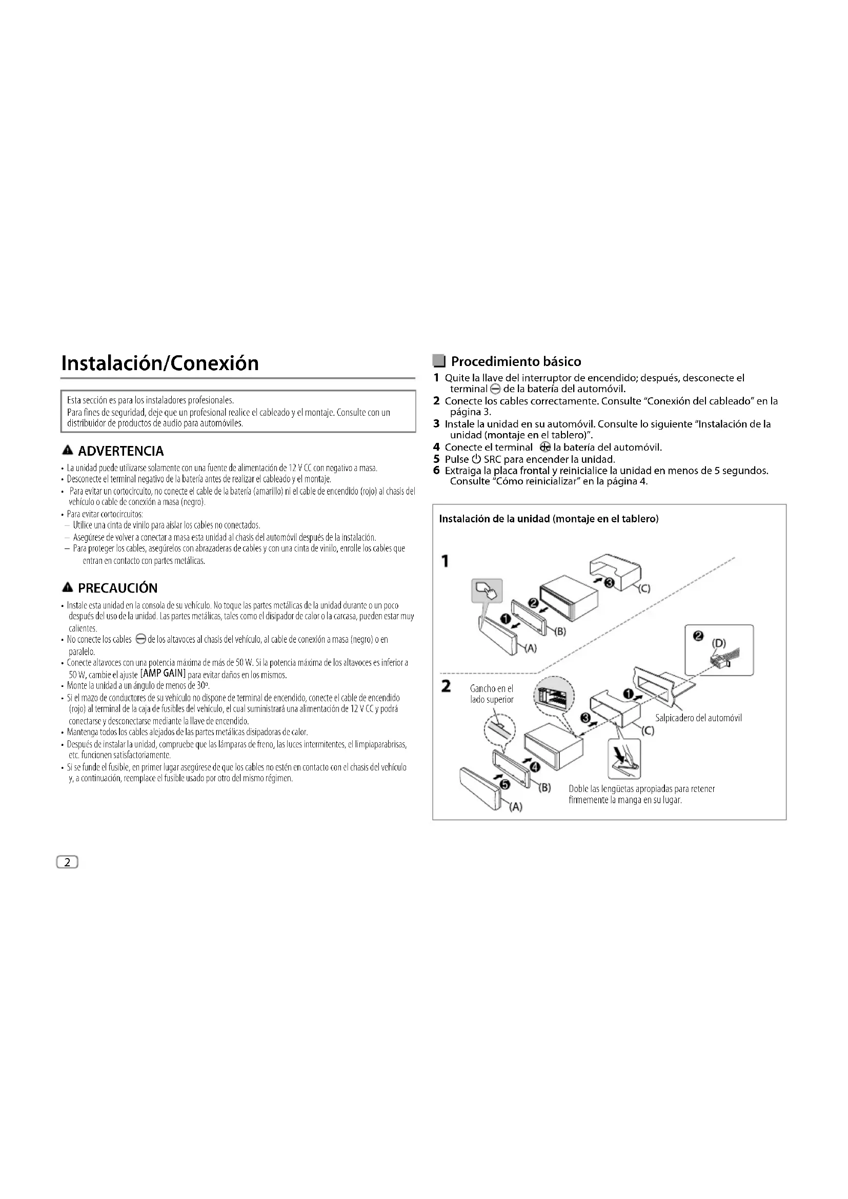 - Pressing enters BT AUDIO directly. 2 Operate the audio player via Bluetooth to start playback. To On the faceplate Play back/pause Press the volume knob. Select group or folder Press 2 J / 1 K. Reverse skip/Forward skip Press S / T. Reverse/Fast-forward Press and hold S / T. Repeat play Press 4 repeatedly. Random play Press 3 repeatedly. KD-X382BT_E_B5K-0867-00_EN_1st Draft.indd 7KD-X382BT_E_B5K-0867-00_EN_1st Draft.indd 7 20/9/2021 10:55:27 AM20/9/2021 10:55:27 AM2 Data Size: B6L (182 mm x 128 mm)Book Size: B6L (182 mm x 128 mm) Procedimiento básico 1 Quite la llave del interruptor de encendido; después, desconecte el terminal de la batería del automóvil. 2 Conecte los cables correctamente. Consulte “Conexión del cableado” en la página 3. 3 Instale la unidad en su automóvil. Consulte lo siguiente “Instalación de la unidad (montaje en el tablero)”. 4 Conecte el terminal de la batería del automóvil. 5 Pulse B SRC para encender la unidad. 6 Extraiga la placa frontal y reinicialice la unidad en menos de 5 segundos. Consulte “Cómo reinicializar” en la página 4. Instalación de la unidad (montaje en el tablero) Instalación/Conexión Esta sección es para los instaladores profesionales. Para fines de seguridad, deje que un profesional realice el cableado y el montaje. Consulte con un distribuidor de productos de audio para automóviles. ADVERTENCIA