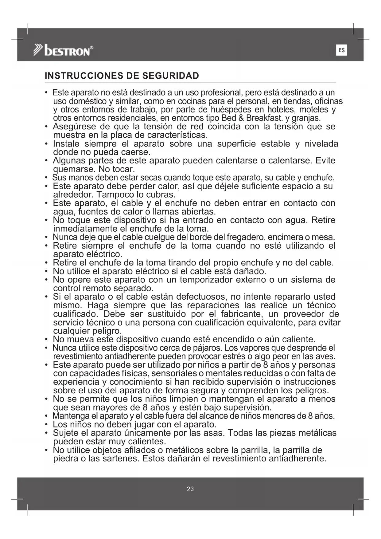 - Su municipio puede indicarle dónde encontrar el punto de recogida de residuos designado en su barrio. SERVICIO En el improbable caso de que se produzca un mal funcionamiento, póngase en contacto con el servicio de atención al cliente de Bestron: www.bestron.com/service Especificaciones técnicas Modelo ABP605 Red eléctrica (V) 220-240V~ Frecuencia (Hz) 50-60 Clase de seguridad I Energía (Watt) 2000 Ruido (dB(A)) - Max. Capacidad - Tiempo máximo de funcionamiento continuo (KB) - Dimensiones (largo x ancho x alto) (cm) 110x25x12 Longitud del cable (cm) 8025