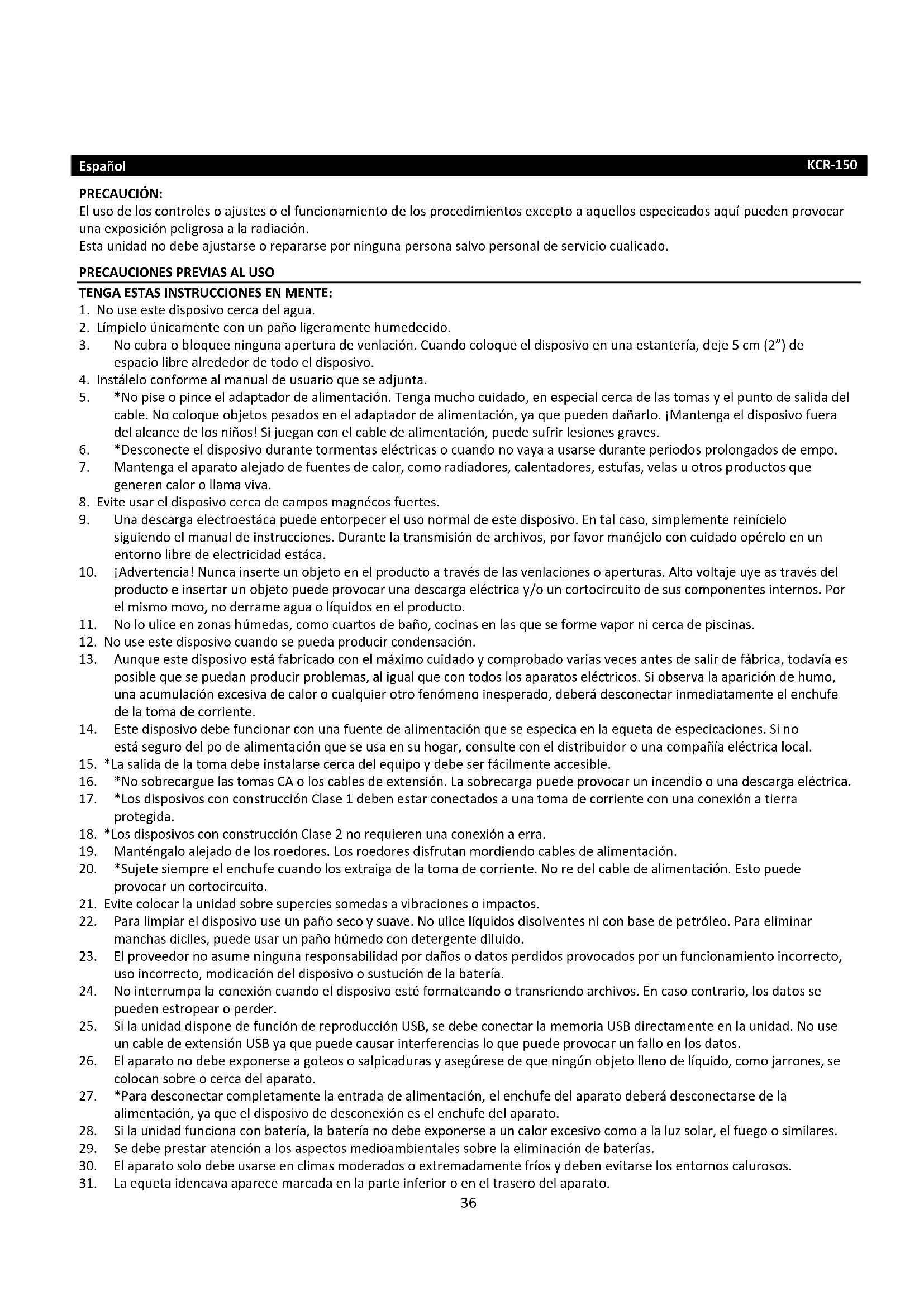 Pour en savoir plus et obtenir de l’assistance, visitez www.lenco.com Lenco Benelux BV, Thermiekstraat 1a, 6361 HB, Nuth, Pays-Bas.36 Español KCR-150 PRECAUCIÓN: El uso de los controles o ajustes o el funcionamiento de los procedimientos excepto a aquellos especificados aquí pueden provocar una exposición peligrosa a la radiación. Esta unidad no debe ajustarse o repararse por ninguna persona salvo personal de servicio cualificado.