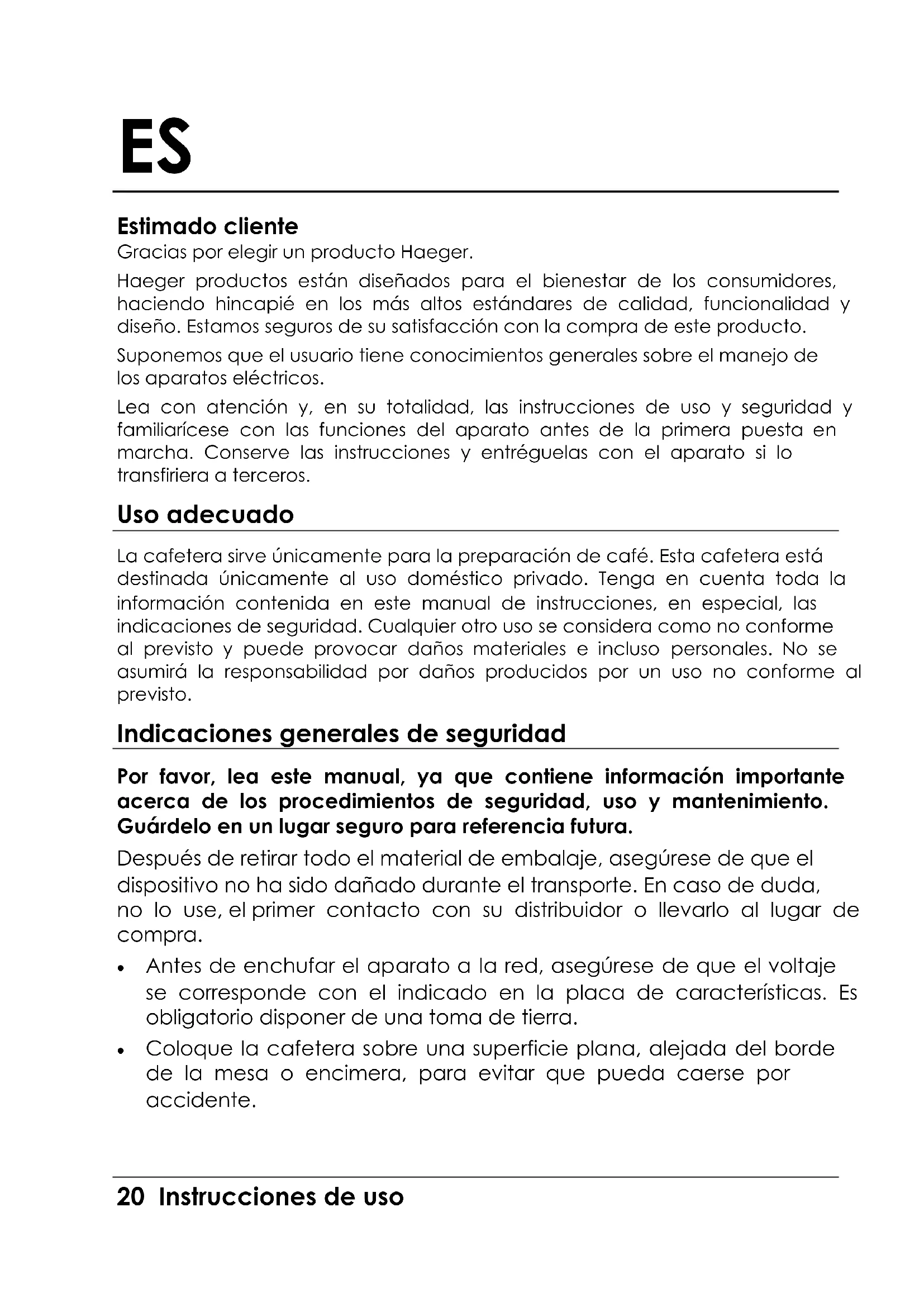 restritos por esta declaração independente do fabricante. O cliente goza de todas as garantias previstas na Diretiva 1999/44/CE do Parlamento Europeu e do Conselho, de 25 de maio. (*) apenas para países da União EuropeiaES 20 Instrucciones de uso Estimado cliente Gracias por elegir un producto Haeger. Haeger productos están diseñados para el bienestar de los consumidores, haciendo hincapié en los más altos estándares de calidad, funcionalidad y diseño. Estamos seguros de su satisfacción con la compra de este producto. Suponemos que el usuario tiene conocimientos generales sobre el manejo de los aparatos eléctricos. Lea con atención y, en su totalidad, las instrucciones de uso y seguridad y familiarícese con las funciones del aparato antes de la primera puesta en marcha. Conserve las instrucciones y entréguelas con el aparato si lo transfiriera a terceros. Uso adecuado La cafetera sirve únicamente para la preparación de café. Esta cafetera está destinada únicamente al uso doméstico privado. Tenga en cuenta toda la información contenida en este manual de instrucciones, en especial, las indicaciones de seguridad. Cualquier otro uso se considera como no conforme al previsto y puede provocar daños materiales e incluso personales. No se asumirá la responsabilidad por daños producidos por un uso no conforme al previsto. Indicaciones generales de seguridad Por favor, lea este manual, ya que contiene información importante acerca de los procedimientos de seguridad, uso y mantenimiento. Guárdelo en un lugar seguro para referencia futura. Después de retirar todo el material de embalaje, asegúrese de que el dispositivo no ha sido dañado durante el transporte. En caso de duda, no lo use, el primer contacto con su distribuidor o llevarlo al lugar de compra.