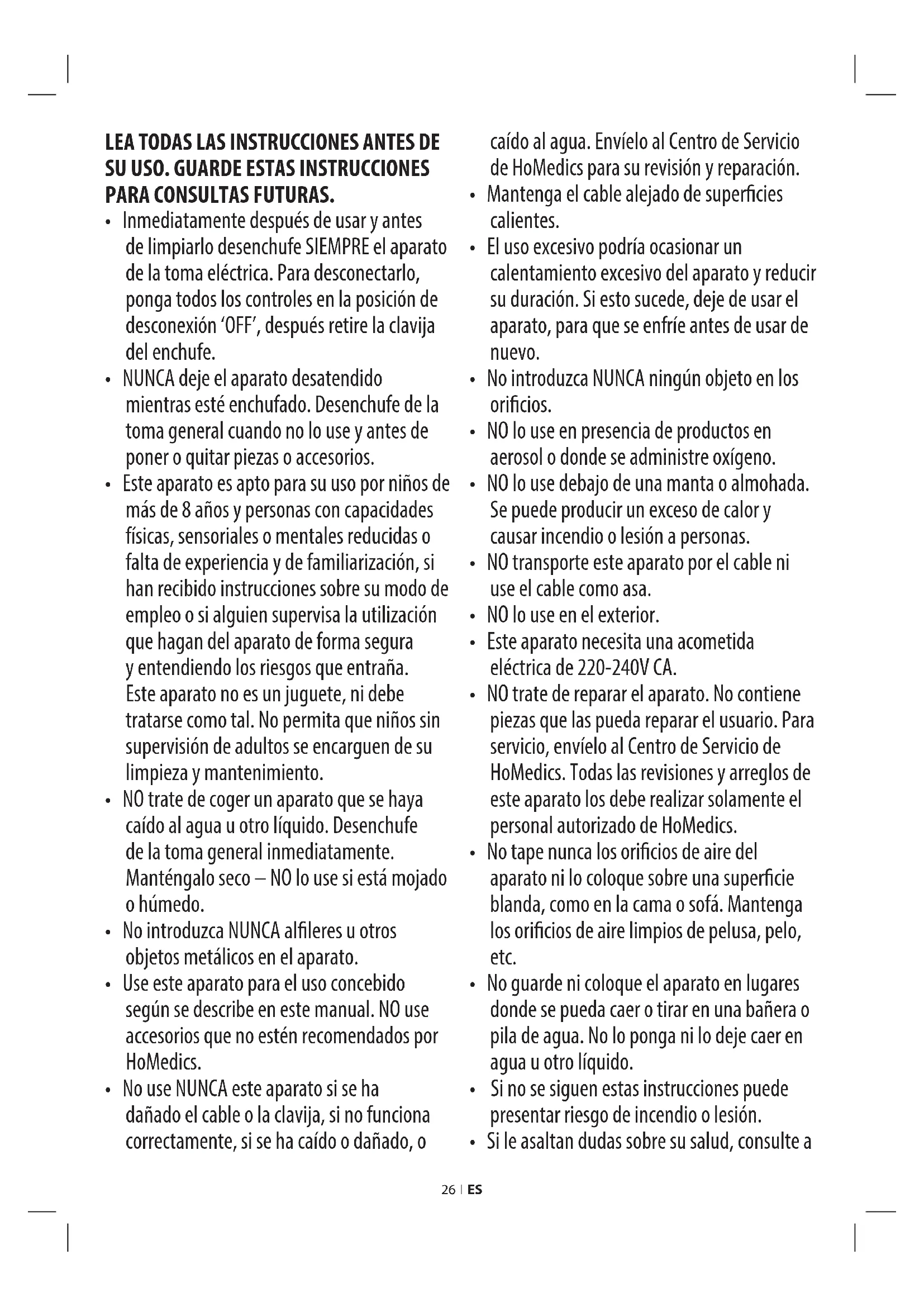 - No use NUNCA este aparato si se ha dañado el cable o la clavija, si no funciona correctamente, si se ha caído o dañado, o caído al agua. Envíelo al Centro de Servicio de HoMedics para su revisión y reparación.