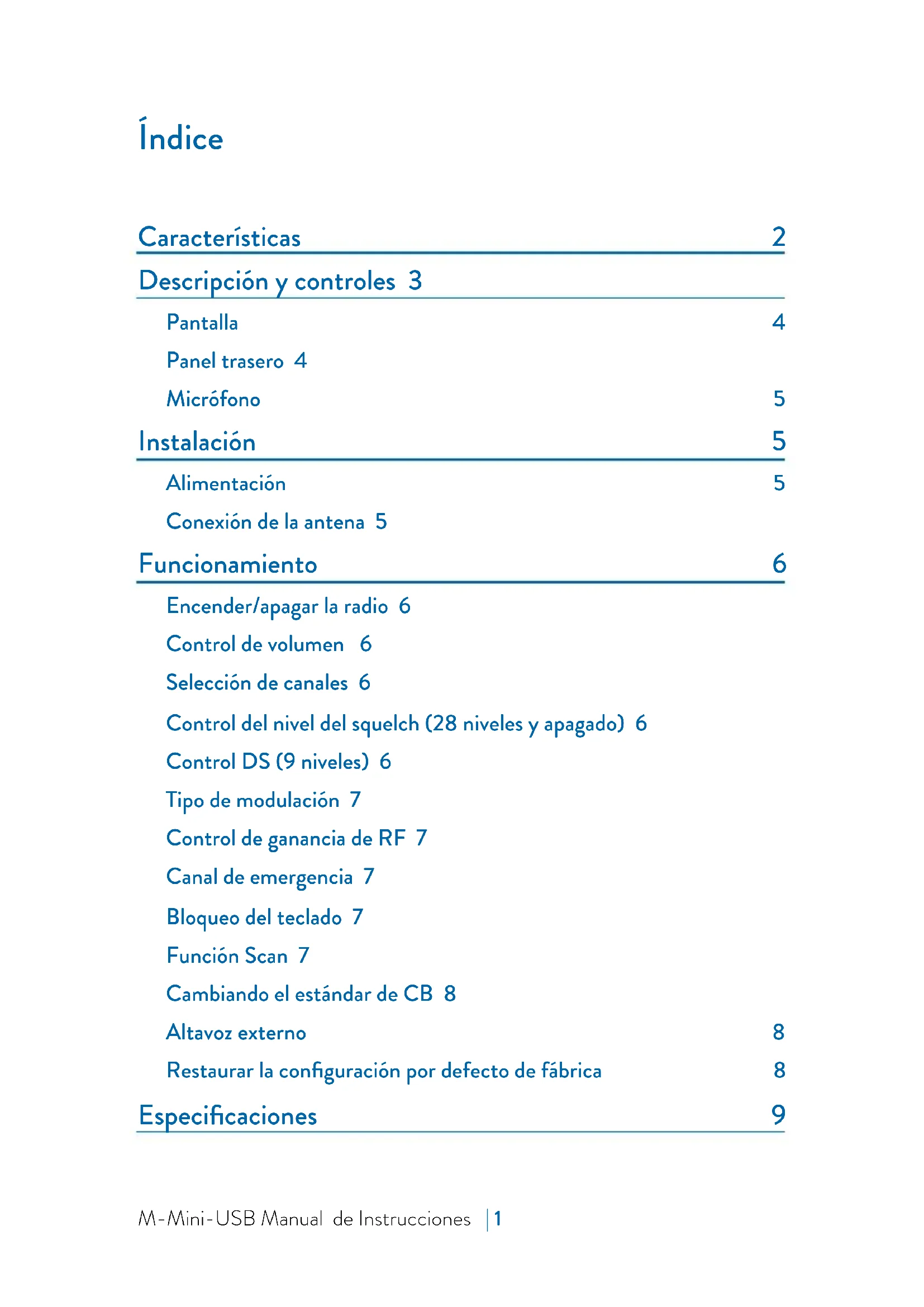 - Alle in Europa zulässigen CB-Frequenzbänder. Technische Änderungen ohne Vorankündigung vorbehalten. Eine leicht zugängliche Trennvorrichtung muss in die Versorgungsleitung eingebaut werden. Die Trennvorrichtung muss beide Pole gleichzeitig trennen.M-Mini-USB Manual de Instrucciones | 1 Índice Características 2 Descripción y controles 3 Pantalla 4 Panel trasero 4 Micrófono 5 Instalación 5 Alimentación 5 Conexión de la antena 5 Funcionamiento 6 Encender/apagar la radio 6 Control de volumen 6 Selección de canales 6 Control del nivel del squelch (28 niveles y apagado) 6 Control DS (9 niveles) 6 Tipo de modulación 7 Control de ganancia de RF 7 Canal de emergencia 7 Bloqueo del teclado 7 Función Scan 7 Cambiando el estándar de CB 8 Altavoz externo 8 Restaurar la configuración por defecto de fábrica 8 Especificaciones 92 | M-Mini-USB Manual de Instrucciones Características Dispositivo multiestandar Puerto USB para cargar tus dispositivos Cable de alimentacion con toma de encendedor incluido Microfono extraible con conector RJ45 y botones Arriba/Abajo Busqueda de canales Pantalla LCD, S-Meter Modo Doble Squelch (9 y 28 niveles) Ganancia de RF Canal de emergencia 9/19 Toma para altavoz externo Dimensiones: 110x120x25mmM-Mini-USB Manual de Instrucciones | 3 Descripción y controles