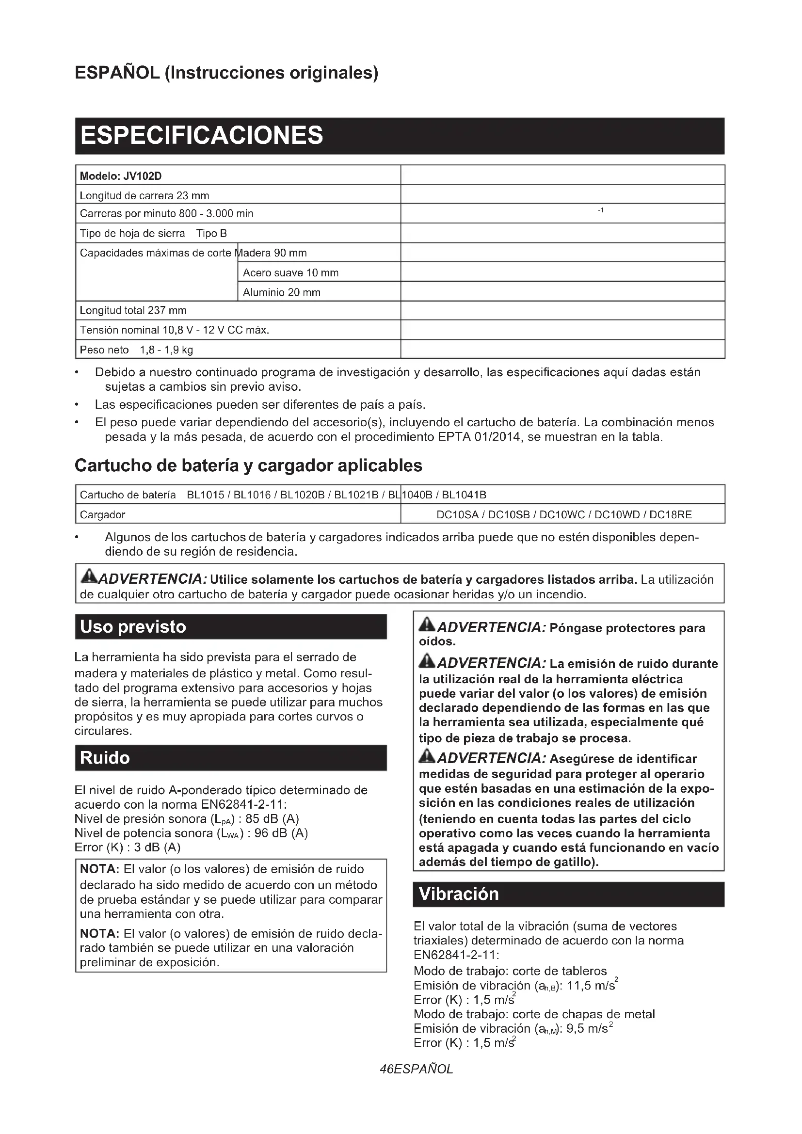 - Algunosdeloscartuchosdebateríaycargadoresindicadosarribapuedequenoesténdisponiblesdepen- diendo de su región de residencia. ADVERTENCIA: Utilice solamente los cartuchos de batería y cargadores listados arriba. La utilización decualquierotrocartuchodebateríaycargadorpuedeocasionarheridasy/ounincendio. Uso previsto La herramienta ha sido prevista para el serrado de madera y materiales de plástico y metal. Como resul- tadodelprogramaextensivoparaaccesoriosyhojas de sierra, la herramienta se puede utilizar para muchos propósitos y es muy apropiada para cortes curvos o circulares. Ruido ElnivelderuidoA-ponderadotípicodeterminadode acuerdoconlanormaEN62841-2-11: Nivel de presión sonora (L