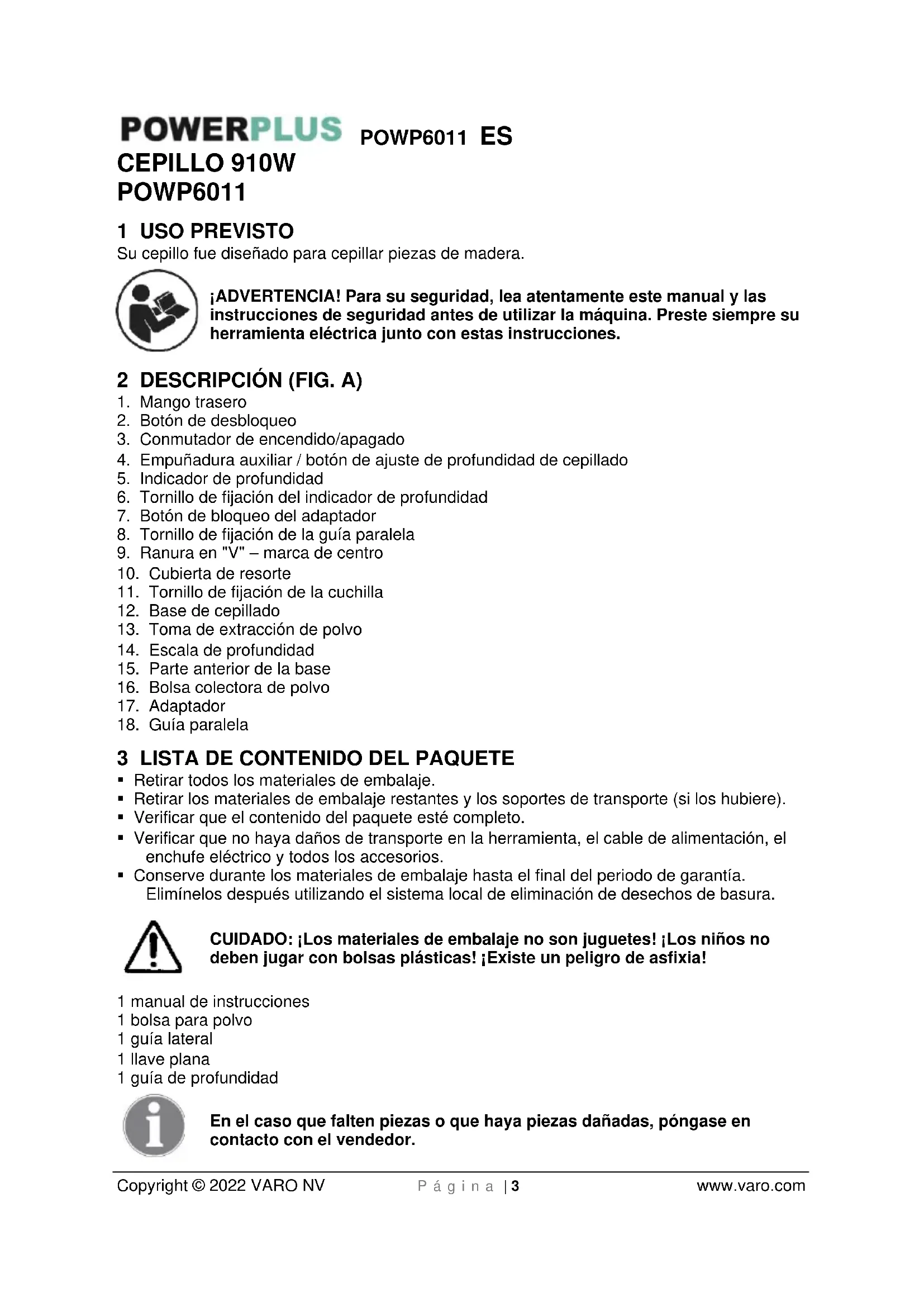 Copyright © 2022 VARO NV P á g i n a | 3 www.varo.com CEPILLO 910W POWP6011 1 USO PREVISTO Su cepillo fue diseñado para cepillar piezas de madera. ¡ADVERTENCIA! Para su seguridad, lea atentamente este manual y las instrucciones de seguridad antes de utilizar la máquina. Preste siempre su herramienta eléctrica junto con estas instrucciones. 2 DESCRIPCIÓN (FIG. A)