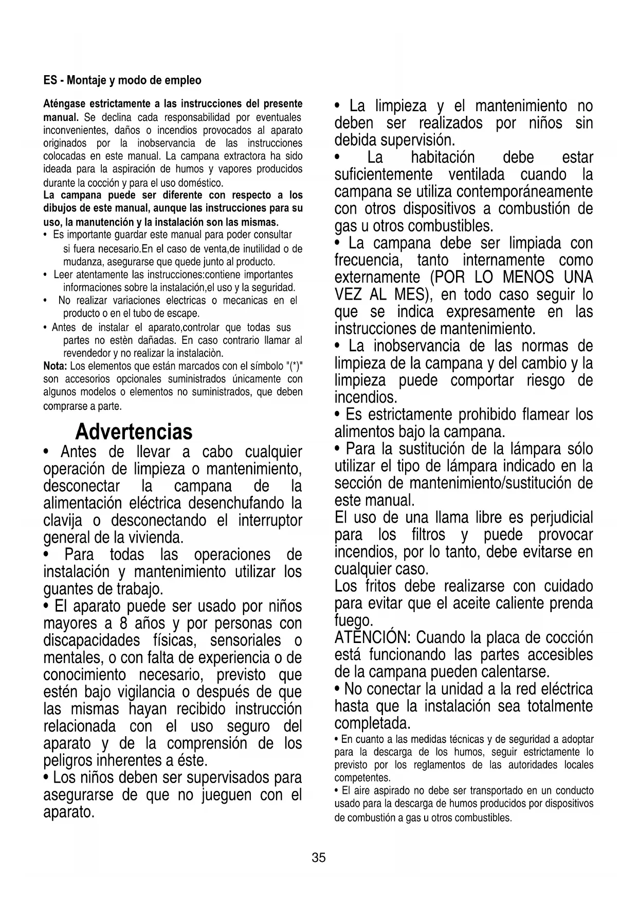 Instalación La distancia mínima entre la superficie de cocción y la parte más baja de la campana no debe ser inferior a 45cm en el caso de cocinas electricas y de 50cm en el caso de cocinas a gas o mixtas. Si las instrucciones para la instalación del dispositivo para cocinar con gas especifican una distancia mayor, hay que tenerlo en consideración. Conexión eléctrica La tensión de red debe corresponder con la tensión indicada en la etiqueta colocada en el interior de la campana.Si es suministrada con un enchufe, conectar la campana a un enchufe conforme a las normas en vigor y colocarlo en una zona accesible, aun después de la instalación. Si no es37 suministrada con enchufe (conexión directa a la red) o clavija y no es posible situarla en un lugar accesible, aun después de la instalación, colocar un interruptor bipolar de acuerdo con las normativas, para asegurarse la desconexión completa a la red en el caso de la categoria de alta tensión III, conforme con las reglas de instalación. ATENCIÓN! Antes de reconectar el circuito de la campana a la red y de verificar el correcto funcionamiento, controlar siempre que el cable de red fue montado correctamente. La campana está provista de un cable de alimentación especial; si el cable se daña, solicite uno nuevo al Servicio de Asistencia Técnica. Montaje Antes de comenzar con la instalación: