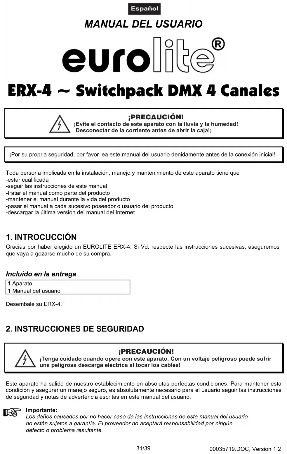 Gracias por haber elegido un EUROLITE ERX-4. Si Vd. respecte las instrucciones sucesivas, aseguremosque vaya a gozarse mucho de su compra. Incluido en la entrega 1 Aparato1 Manual del usuarioDesembale su ERX-4.