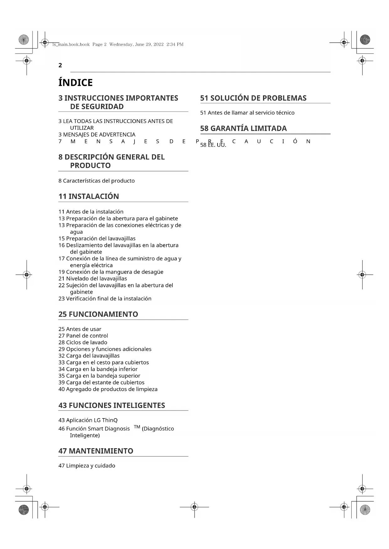 PRODUCTO 8 Características del producto 11 INSTALACIÓN 11 Antes de la instalación 13 Preparación de la abertura para el gabinete 13 Preparación de las conexiones eléctricas y de agua 15 Preparación del lavavajillas 16 Deslizamiento del lavavajillas en la abertura del gabinete 17 Conexión de la línea de suministro de agua y energía eléctrica 19 Conexión de la manguera de desagüe 21 Nivelado del lavavajillas 22 Sujeción del lavavajillas en la abertura del gabinete 23 Verificación final de la instalación 25 FUNCIONAMIENTO 25 Antes de usar 27 Panel de control 28 Ciclos de lavado 29 Opciones y funciones adicionales 32 Carga del lavavajillas 33 Carga en el cesto para cubiertos 34 Carga en la bandeja inferior 35 Carga en la bandeja superior 39 Carga del estante de cubiertos 40 Agregado de productos de limpieza 43 FUNCIONES INTELIGENTES 43 Aplicación LG ThinQ 46 Función Smart Diagnosis