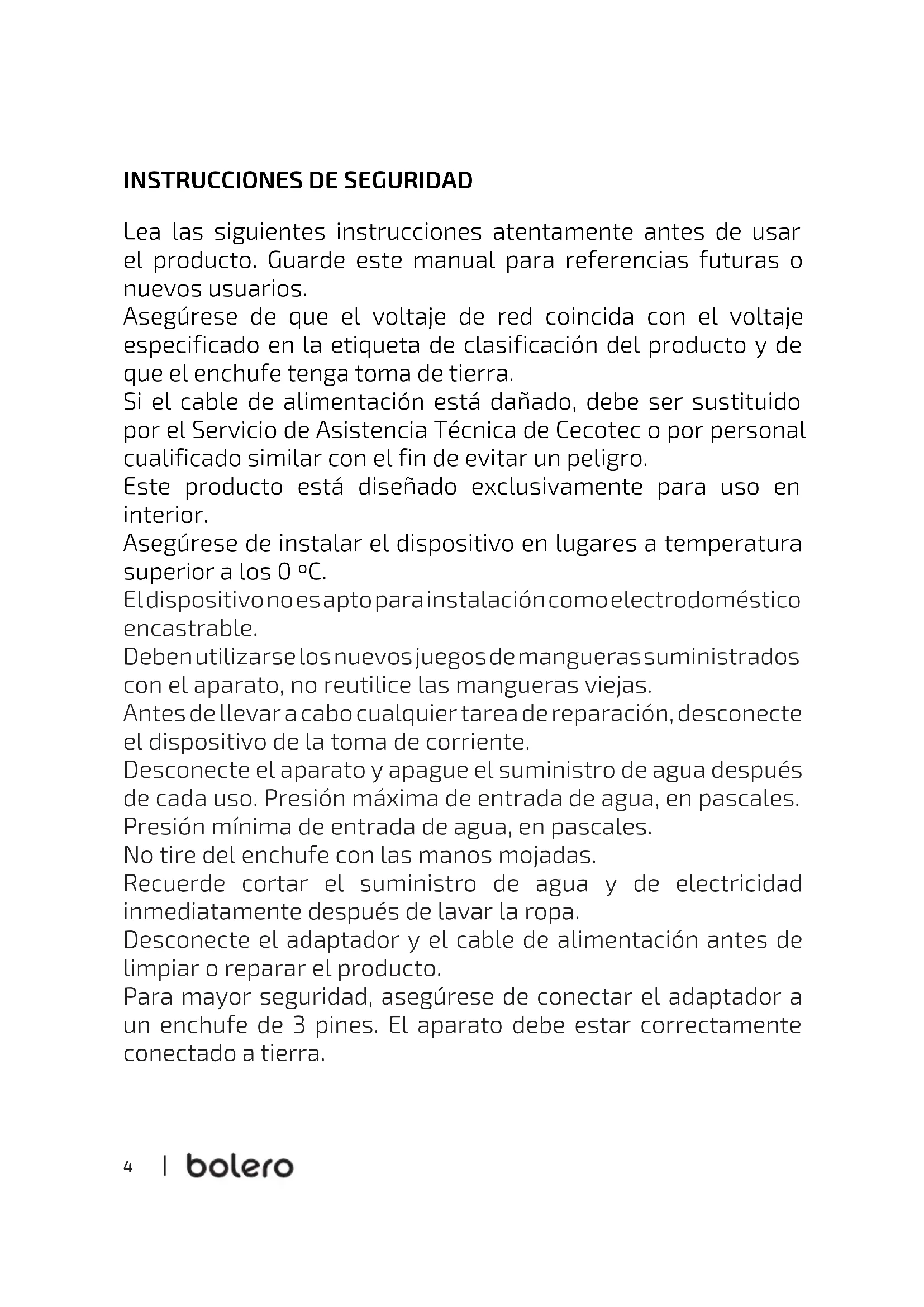 Lea las siguientes instrucciones atentamente antes de usar el producto. Guarde este manual para referencias futuras o nuevos usuarios. Asegúrese de que el voltaje de red coincida con el voltaje especificado en la etiqueta de clasificación del producto y de que el enchufe tenga toma de tierra. Si el cable de alimentación está dañado, debe ser sustituido por el Servicio de Asistencia Técnica de Cecotec o por personal cualificado similar con el fin de evitar un peligro. Este producto está diseñado exclusivamente para uso en interior. Asegúrese de instalar el dispositivo en lugares a temperatura superior a los 0 ºC. El dispositivo no es apto para instalación como electrodoméstico encastrable. Deben utilizarse los nuevos juegos de mangueras suministrados con el aparato, no reutilice las mangueras viejas. Antes de llevar a cabo cualquier tarea de reparación, desconecte el dispositivo de la toma de corriente. Desconecte el aparato y apague el suministro de agua después de cada uso. Presión máxima de entrada de agua, en pascales. Presión mínima de entrada de agua, en pascales. No tire del enchufe con las manos mojadas. Recuerde cortar el suministro de agua y de electricidad inmediatamente después de lavar la ropa. Desconecte el adaptador y el cable de alimentación antes de limpiar o reparar el producto. Para mayor seguridad, asegúrese de conectar el adaptador a un enchufe de 3 pines. El aparato debe estar correctamente conectado a tierra. IM 02317 02322 02327 02332 02319 02324 02328 02333 Lavadora Bolero DressCode_IC_YV_02210311.indd 4IM 02317 02322 02327 02332 02319 02324 02328 02333 Lavadora Bolero DressCode_IC_YV_02210311.indd 4 11/3/21 17:2411/3/21 17:245 DRESSCODE 7200 / 8200 / 9200 / 10200 INVERTER