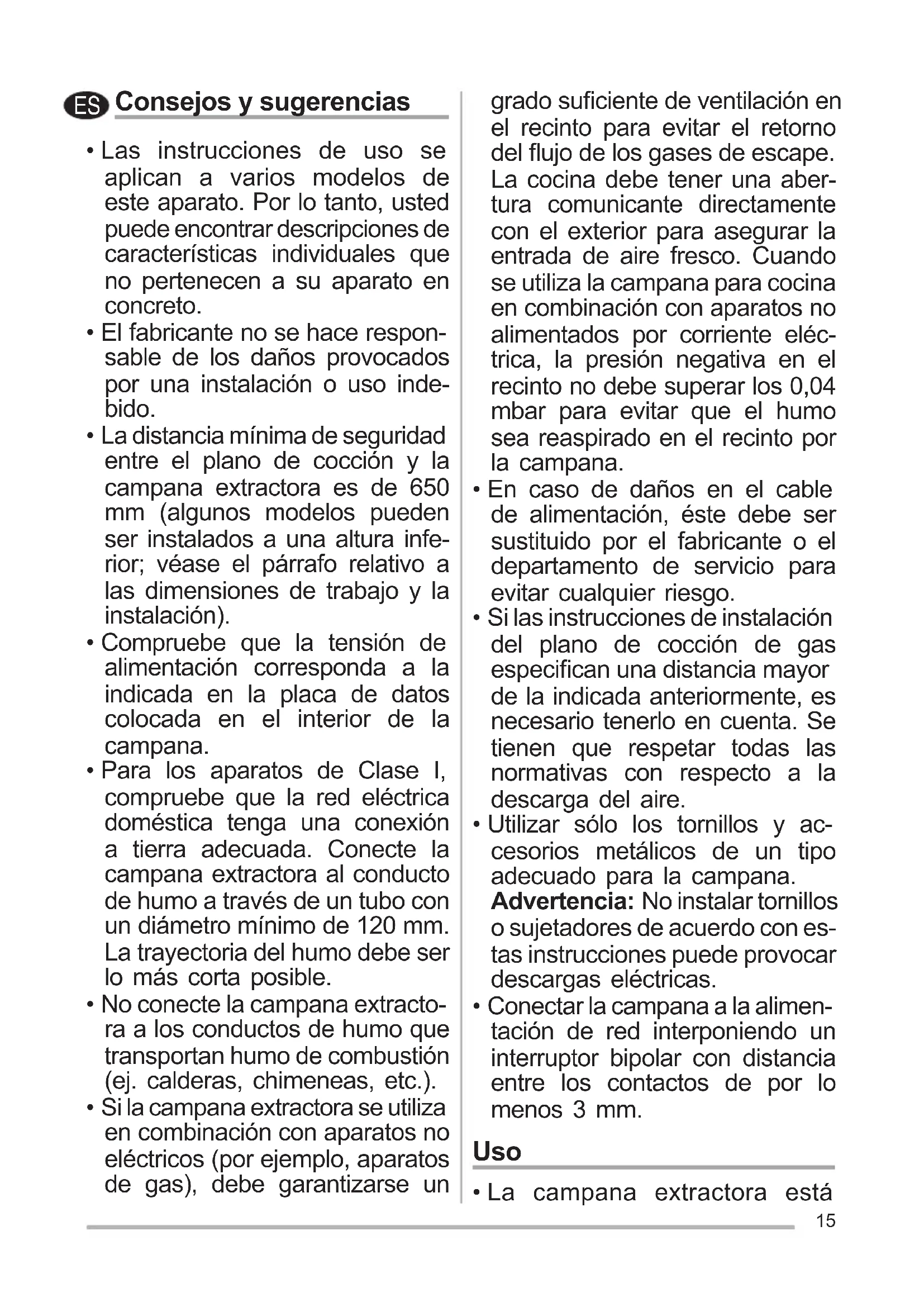 - La campana extractora está ES16 diseñada exclusivamente para uso doméstico, para eliminar los olores de la cocina.