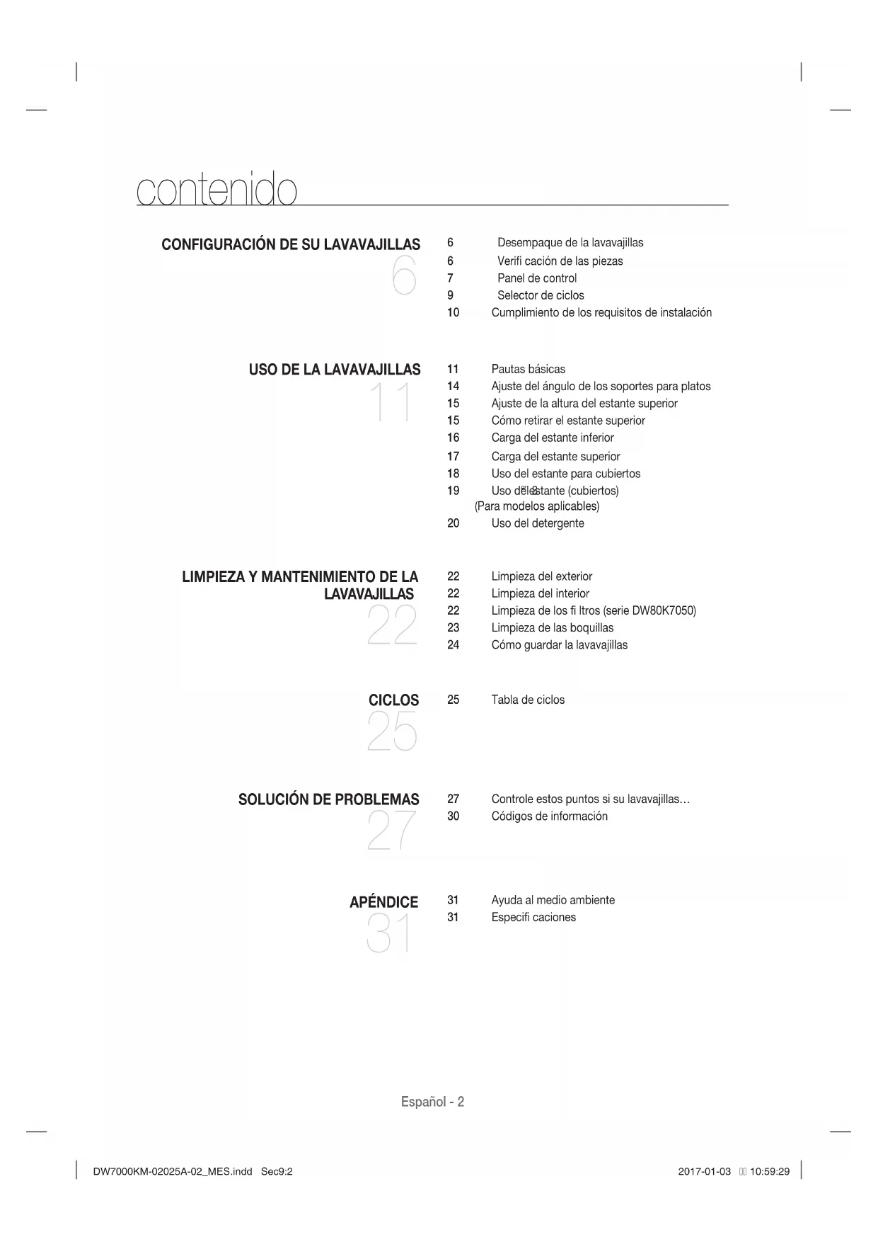DW7000KM-02025A-01_MES.indd Sec1:4DW7000KM-02025A-02_MES.indd Sec1:4 2016-05-18 10:59:292017-01-03 10:59:29Español - 5 No vierta gasolina, solventes ni otros materiales infl amables dentro de la lavavajillas. No lave vajilla que haya sido expuesta a estos materiales.Mantenga el detergente de la lavavajillas fuera del alcance de los niños. El detergente causa un efecto adverso en los órganos del cuerpo humano. Contiene sustancias para otorgar brillo y es corrosivo. Evite que el detergente entre en contacto con la piel o los ojos.No empuje ni presione la puerta cuando esté abierta, ya que al hacerlo podría dañar la lavavajillas o hacerse daño.No permita que los niños jueguen dentro o encima de la máquina lavavajillas. Pueden hacerse daño o dañar la lavavajillas.Desconecte el cable de alimentación (o corte el disyuntor) antes de realizar el mantenimiento de la lavavajillas.No repare, reemplace ni realice el mantenimiento de ninguna de las piezas de su lavavajillas por su cuenta. Solo se permite que técnicos califi cados autorizados realicen el desensamble, las reparaciones y las modifi caciones. El trabajo efectuado por una persona no autorizada puede invalidar su garantía.Antes de deshacerse de la lavavajillas, retire la puerta del compartimiento de lavado o la traba de la puerta para evitar que niños o animales pequeños puedan quedar atrapados adentro.Si no va a utilizarse la lavavajillas durante un período prolongado, corte el suministro de agua.Esta lavavajillas ha sido diseñada para uso residencial únicamente.