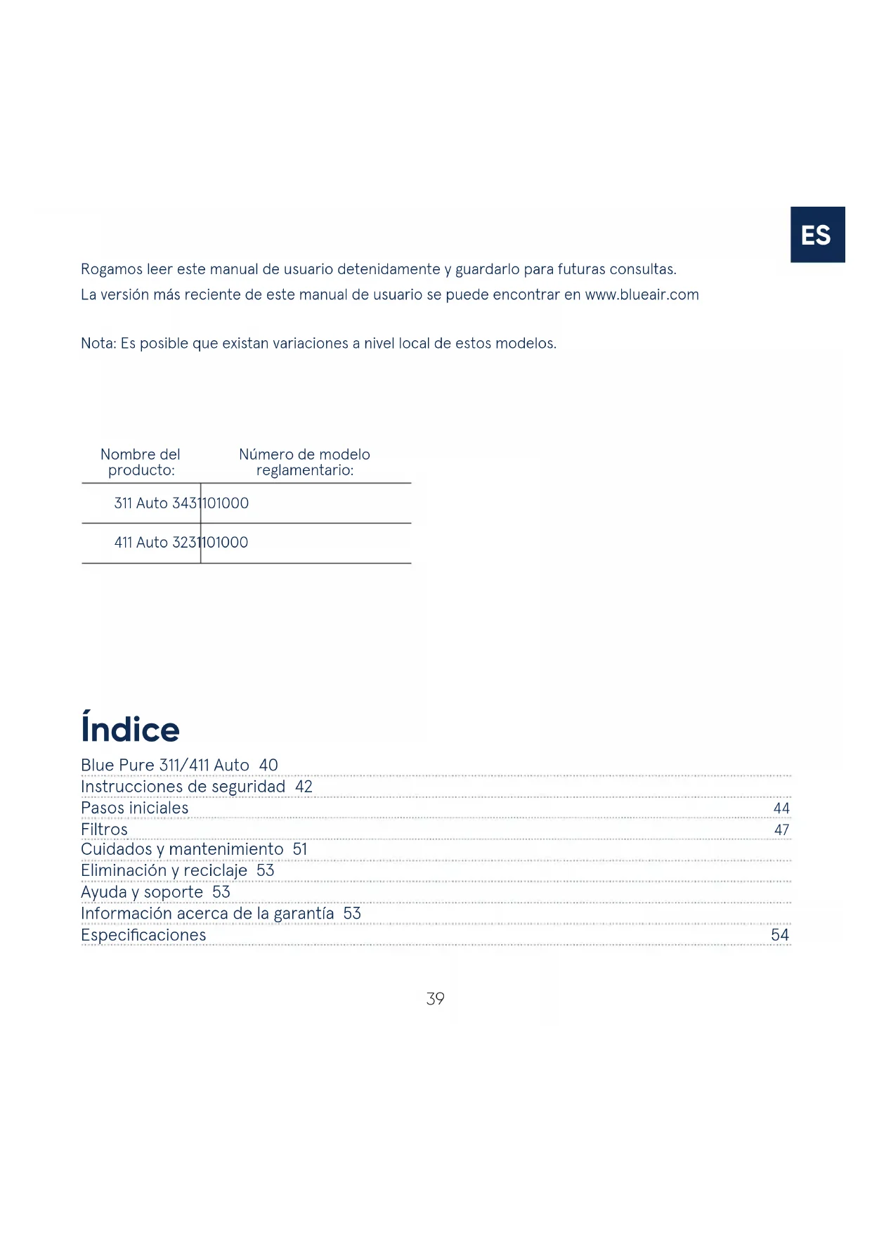 Blue Pure 311/411 Auto 40 Instrucciones de seguridad 42 Pasos iniciales 44 Filtros 47 Cuidados y mantenimiento 51 Eliminación y reciclaje 53 Ayuda y soporte 53 Información acerca de la garantía 53 Especificaciones 54 Índice Rogamos leer este manual de usuario detenidamente y guardarlo para futuras consultas. La versión más reciente de este manual de usuario se puede encontrar en www.blueair.com Nota: Es posible que existan variaciones a nivel local de estos modelos. Nombre del producto: Número de modelo reglamentario: 311 Auto 3431101000 411 Auto 323110100040 Blue Pure 311/411 Auto Blue Pure purificador de aire está compuesto principalmente por un motor, un ventilador y un filtro. El purificador de aire elimina los contaminantes del aire dentro de una estancia para mejorar la calidad del aire interior. Puede cambiar la configuración del purificador de aire en cualquier momento, utilizando el panel de control del purificador de aire. Recomendaciones para un mejor funcionamiento