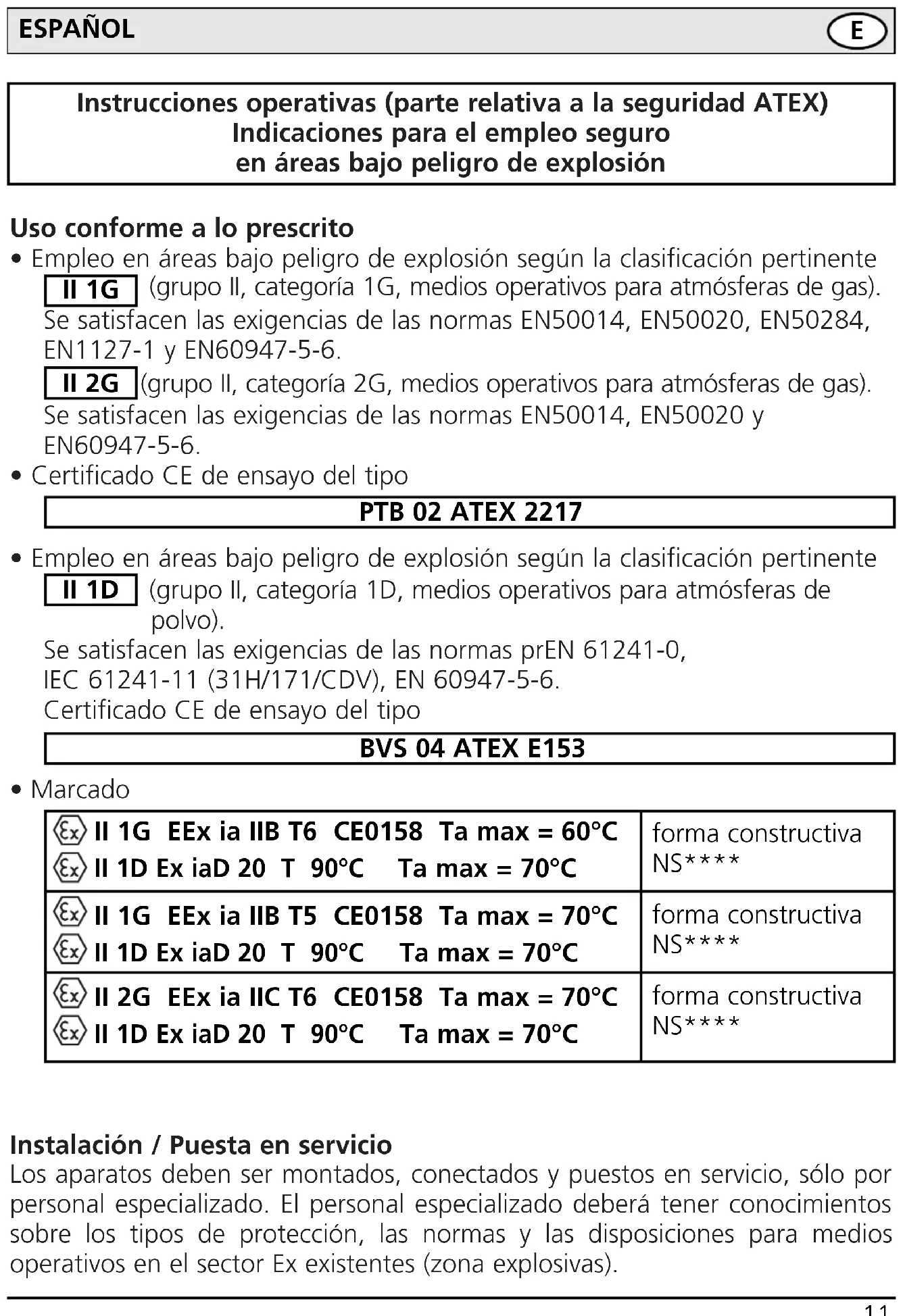 - Marcado Instalación / Puesta en servicio Los aparatos deben ser montados, conectados y puestos en servicio, sólo por personal especializado. El personal especializado deberá tener conocimientos sobre los tipos de protección, las normas y las disposiciones para medios operativos en el sector Ex existentes (zona explosivas).