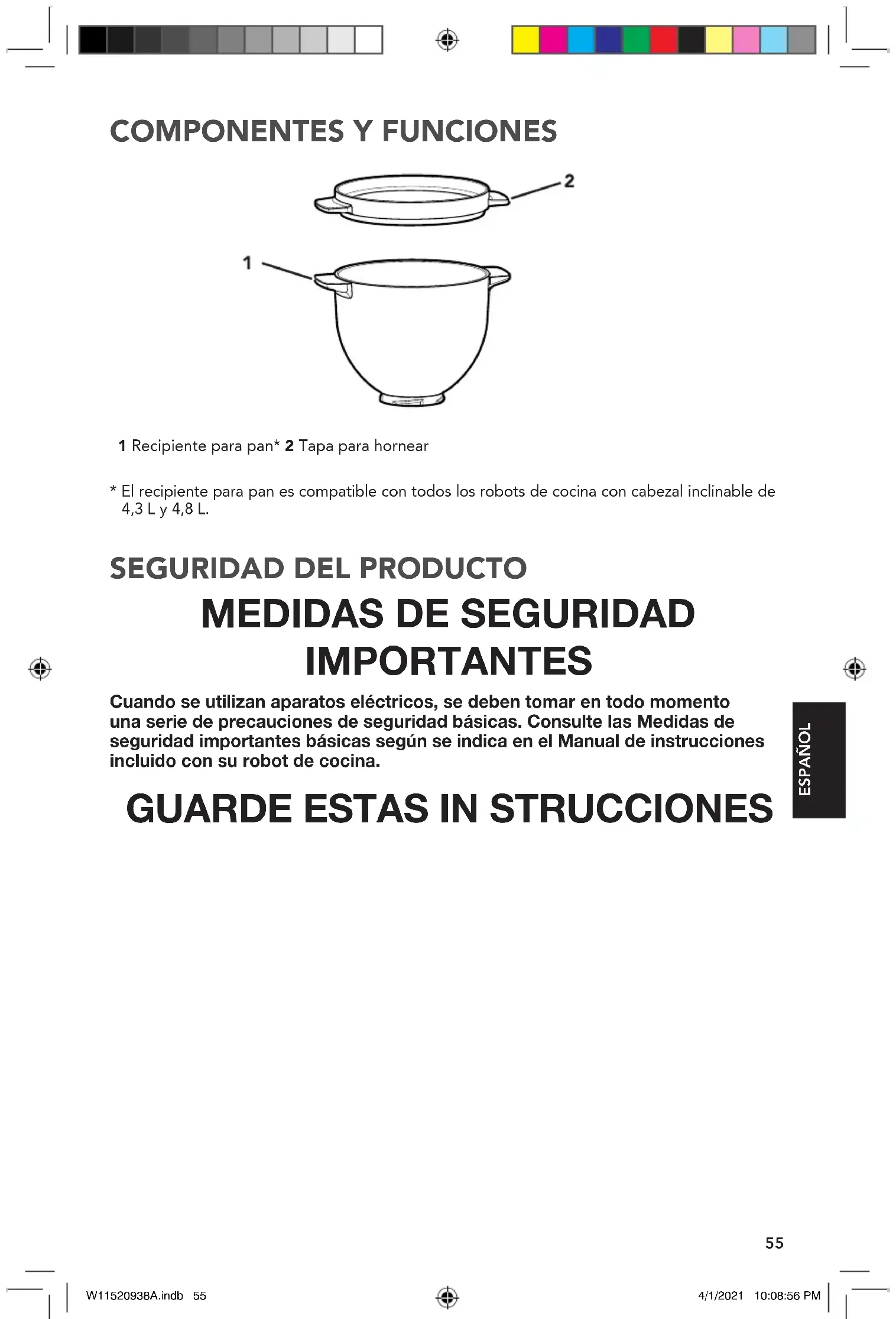 - El recipiente para pan es compatible con todos los robots de cocina con cabezal inclinable de 4,3L y 4,8L. W11520938A.indb 55W11520938A.indb 55 4/1/2021 10:08:56 PM4/1/2021 10:08:56 PM56 Coloque el recipiente para pan sobre la placa de sujeción para fijarlo en su sitio.