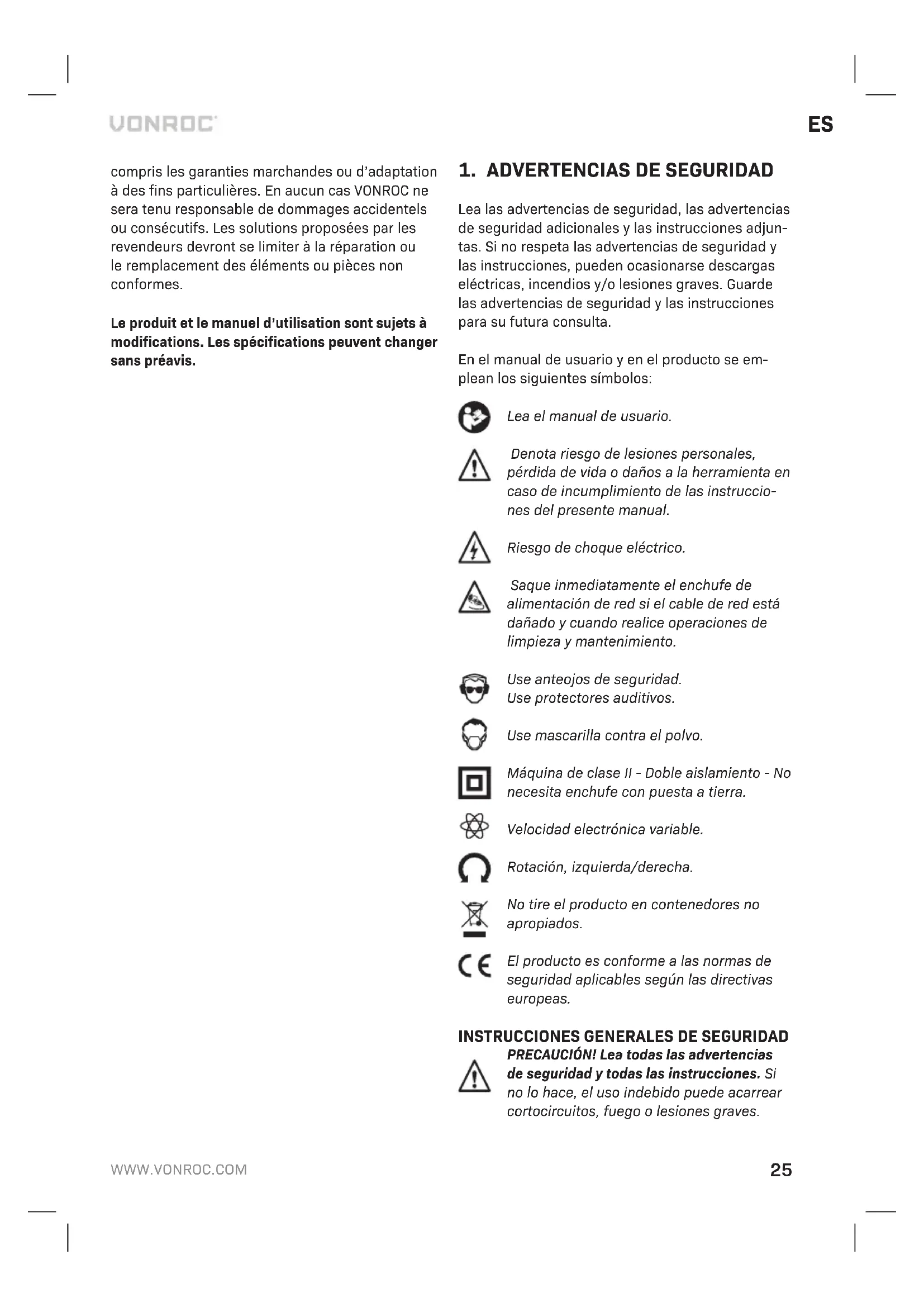 - Si se han utilizado piezas de repuesto no origi- nales. La presente constituye la única garantía implícita y explícita que ofrece la compañía. No existen otras garantías explícitas o implícitas que excedan las citadas aquí, incluidas las garantías implícitas de comerciabilidad e idoneidad para una finalidad en especial. VONROC no será considerada responsa- ble en ningún caso por daños incidentales o consecuentes. Los recursos a disposición de los distribuidores se limitan a la reparación o a la sus- titución de las unidades o piezas no conformes. El producto y el manual de usuario están sujetos a variaciones. Las especificaciones pueden variarse sin previo aviso.31