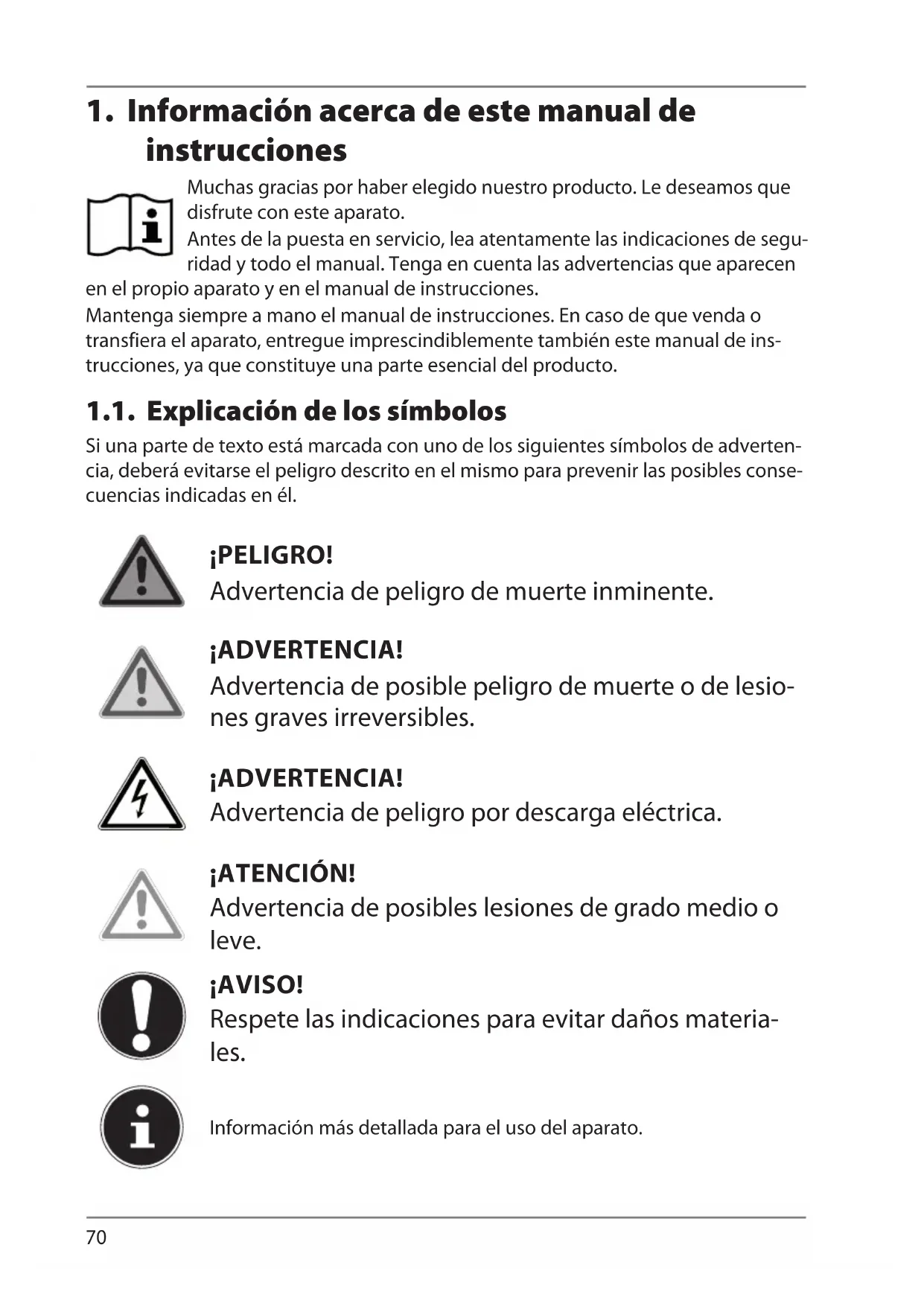 instrucciones Muchas gracias por haber elegido nuestro producto. Le deseamos que disfrute con este aparato. Antes de la puesta en servicio, lea atentamente las indicaciones de segu- ridad y todo el manual. Tenga en cuenta las advertencias que aparecen en el propio aparato y en el manual de instrucciones. Mantenga siempre a mano el manual de instrucciones. En caso de que venda o transfiera el aparato, entregue imprescindiblemente también este manual de ins- trucciones, ya que constituye una parte esencial del producto. 1.1. Explicación de los símbolos Si una parte de texto está marcada con uno de los siguientes símbolos de adverten- cia, deberá evitarse el peligro descrito en el mismo para prevenir las posibles conse- cuencias indicadas en él. ¡PELIGRO! Advertencia de peligro de muerte inminente. ¡ADVERTENCIA! Advertencia de posible peligro de muerte o de lesio- nes graves irreversibles. ¡ADVERTENCIA! Advertencia de peligro por descarga eléctrica. ¡ATENCIÓN! Advertencia de posibles lesiones de grado medio o leve. ¡AVISO! Respete las indicaciones para evitar daños materia- les. Información más detallada para el uso del aparato.DE