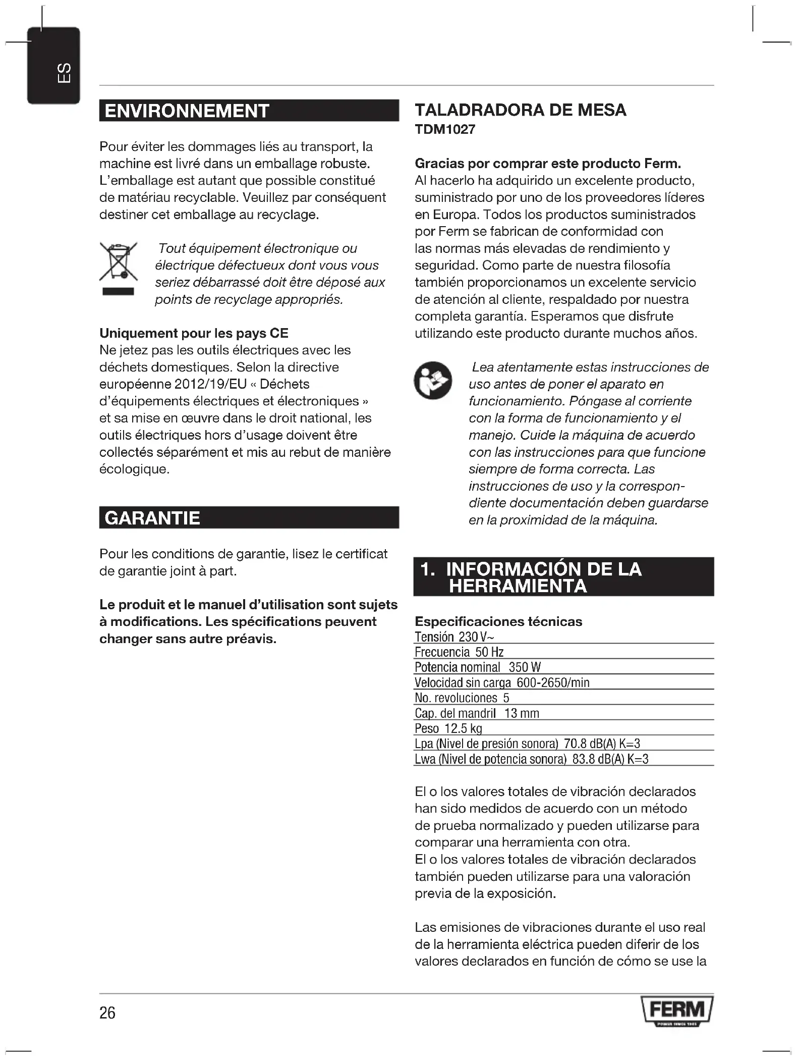TDM1027 Gracias por comprar este producto Ferm. Al hacerlo ha adquirido un excelente producto, suministrado por uno de los proveedores líderes en Europa. Todos los productos suministrados por Ferm se fabrican de conformidad con las normas más elevadas de rendimiento y seguridad. Como parte de nuestra filosofía también proporcionamos un excelente servicio de atención al cliente, respaldado por nuestra completa garantía. Esperamos que disfrute utilizando este producto durante muchos años. Lea atentamente estas instrucciones de uso antes de poner el aparato en funcionamiento. Póngase al corriente con la forma de funcionamiento y el manejo. Cuide la máquina de acuerdo con las instrucciones para que funcione siempre de forma correcta. Las instrucciones de uso y la correspon- diente documentación deben guardarse en la proximidad de la máquina.