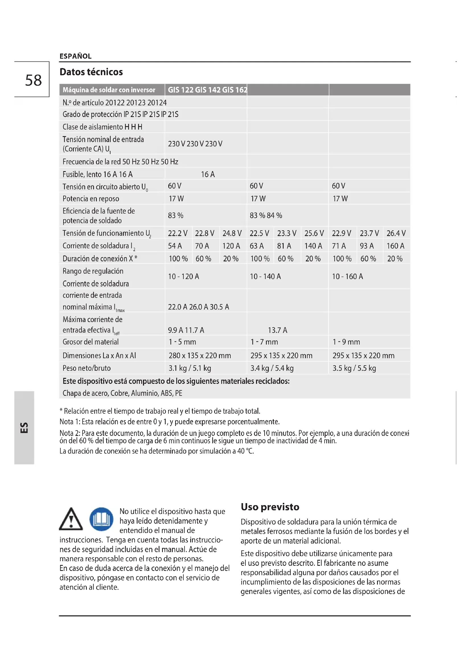 Uso previsto Dispositivo de soldadura para la unión térmica de metales ferrosos mediante la fusión de los bordes y el aporte de un material adicional. Este dispositivo debe utilizarse únicamente para el uso previsto descrito. El fabricante no asume responsabilidad alguna por daños causados por el incumplimiento de las disposiciones de las normas generales vigentes, así como de las disposiciones de No utilice el dispositivo hasta que haya leído detenidamente y entendido el manual de instrucciones. Tenga en cuenta todas las instruccio- nes de seguridad incluidas en el manual. Actúe de manera responsable con el resto de personas. En caso de duda acerca de la conexión y el manejo del dispositivo, póngase en contacto con el servicio de atención al cliente. ESPAÑOL Datos técnicos Máquina de soldar con inversor