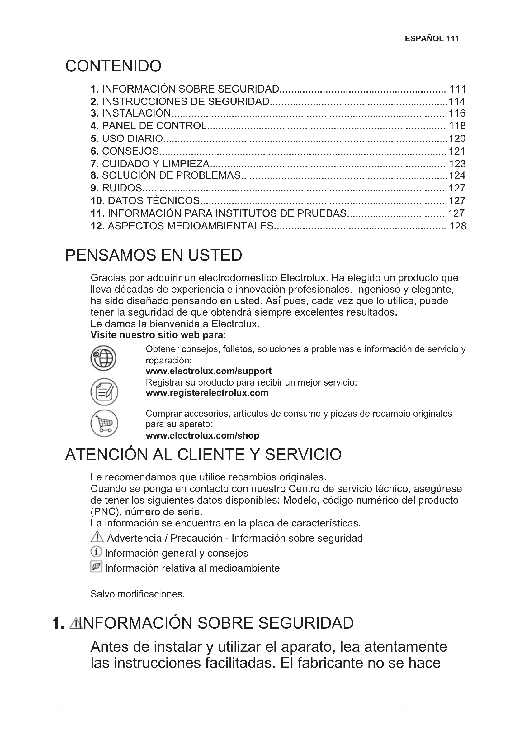 Gracias por adquirir un electrodoméstico Electrolux. Ha elegido un producto que lleva décadas de experiencia e innovación profesionales. Ingenioso y elegante, ha sido diseñado pensando en usted. Así pues, cada vez que lo utilice, puede tener la seguridad de que obtendrá siempre excelentes resultados. Le damos la bienvenida a Electrolux. Visite nuestro sitio web para: Obtener consejos, folletos, soluciones a problemas e información de servicio y reparación: www.electrolux.com/support Registrar su producto para recibir un mejor servicio: www.registerelectrolux.com Comprar accesorios, artículos de consumo y piezas de recambio originales para su aparato: www.electrolux.com/shop