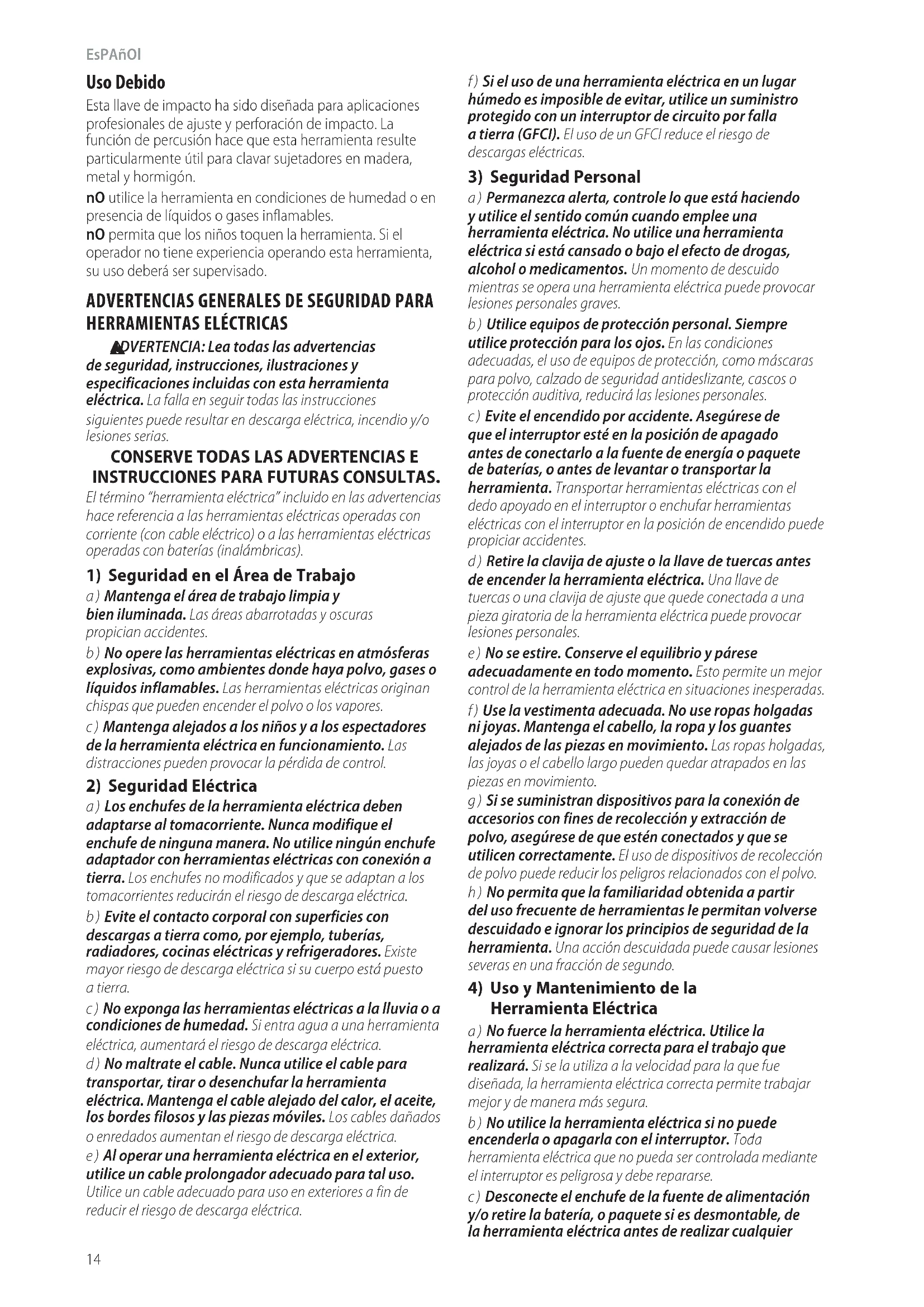 ADVERTENCIA: Las llaves de impacto no son torquimetros. NO USE esta herramienta para apretar sujetadores a pares de apriete especialicos. Se debe usar dispositivo de medicacion de par de apriete independiente calibrado tal como un torquimetro cuando sujetadores con bajo o excesso de apriete能把an guiar a la falla de la unio