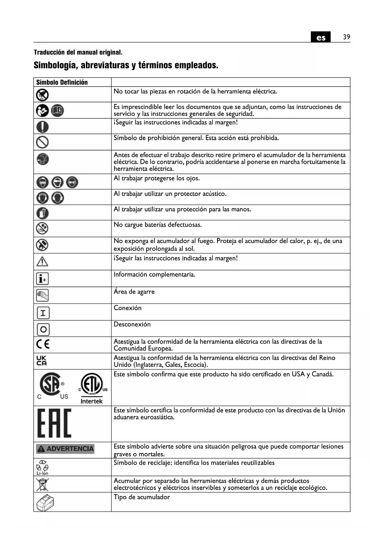 Traducción del manual original. Simbología, abreviaturas y términos empleados. Símbolo Definición No tocar las piezas en rotación de la herramienta eléctrica. Es imprescindible leer los documentos que se adjuntan, como las instrucciones de servicio y las instrucciones generales de seguridad. ¡Seguir las instrucciones indicadas al margen! Símbolo de prohibición general. Esta acción está prohibida. Antes de efectuar el trabajo descrito retire primero el acumulador de la herramienta eléctrica. De lo contrario, podría accidentarse al ponerse en marcha fortuitamente la herramienta eléctrica. Al trabajar protegerse los ojos. Al trabajar utilizar un protector acústico. Al trabajar utilizar una protección para las manos. No cargue baterías defectuosas. No exponga el acumulador al fuego. Proteja el acumulador del calor, p. ej., de una exposición prolongada al sol. ¡Seguir las instrucciones indicadas al margen! Información complementaria. Área de agarre Conexión Desconexión Atestigua la conformidad de la herramienta eléctrica con las directivas de la Comunidad Europea. Atestigua la conformidad de la herramienta eléctrica con las directivas del Reino Unido (Inglaterra, Gales, Escocia). Este símbolo confirma que este producto ha sido certificado en USA y Canadá. Este símbolo certifica la conformidad de este producto con las directivas de la Unión aduanera euroasiática. Este símbolo advierte sobre una situación peligrosa que puede comportar lesiones graves o mortales. Símbolo de reciclaje: identifica los materiales reutilizables Acumular por separado las herramientas eléctricas y demás productos electrotécnicos y eléctricos inservibles y someterlos a un reciclaje ecológico. Tipo de acumulador ADVERTENCIA40