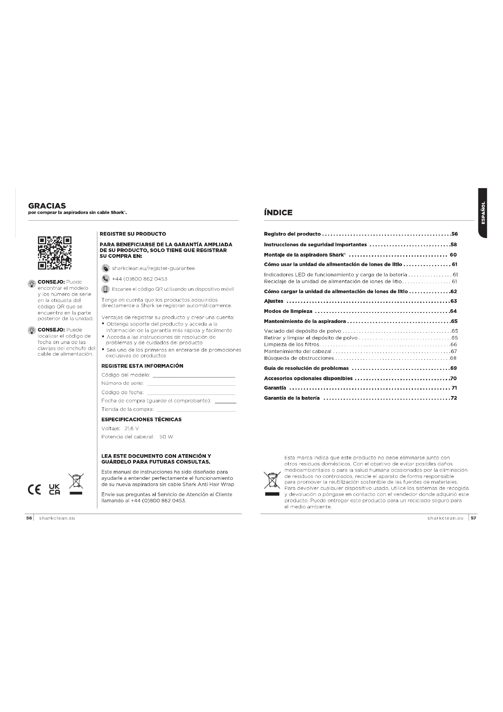 PARA BENEFICIARSE DE LA GARANTÍA AMPLIADA DE SU PRODUCTO, SOLO TIENE QUE REGISTRAR SU COMPRA EN: sharkclean.eu/register-guarantee +44 (0)800 862 0453 Escanee el código QR utilizando un dispositivo móvil GRACIAS por comprar la aspiradora sin cable Shark®. LEA ESTE DOCUMENTO CON ATENCIÓN Y GUÁRDELO PARA FUTURAS CONSULTAS. Este manual de instrucciones ha sido diseñado para ayudarle a entender perfectamente el funcionamiento de su nueva aspiradora sin cable Shark Anti Hair Wrap Envíe sus preguntas al Servicio de Atención al Cliente llamando al +44 (0)800 862 0453. Ventajas de registrar su producto y crear una cuenta: