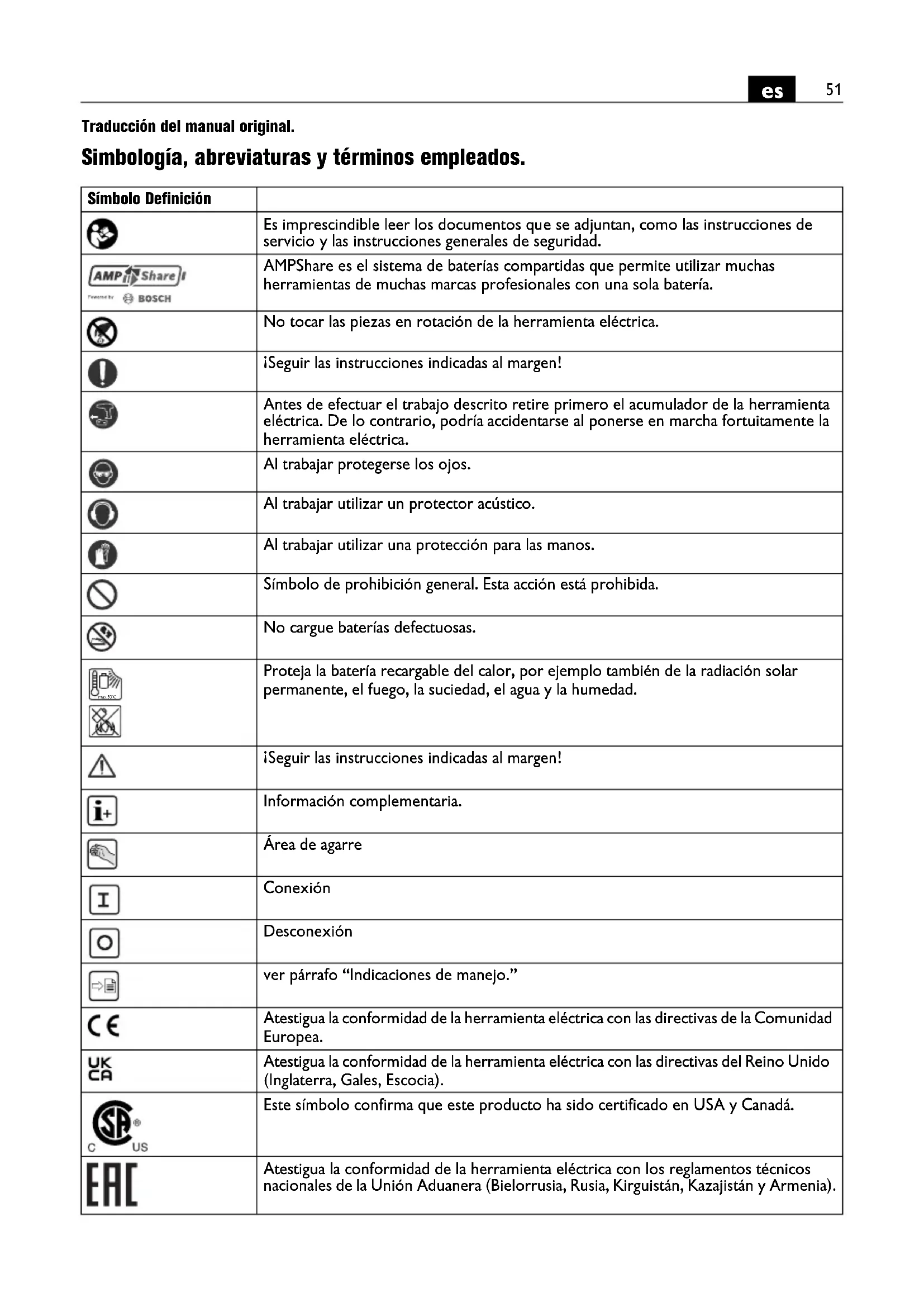 Traducción del manual original. Simbología, abreviaturas y términos empleados. Símbolo Definición Es imprescindible leer los documentos que se adjuntan, como las instrucciones de servicio y las instrucciones generales de seguridad. AMPShare es el sistema de baterías compartidas que permite utilizar muchas herramientas de muchas marcas profesionales con una sola batería. No tocar las piezas en rotación de la herramienta eléctrica. ¡Seguir las instrucciones indicadas al margen! Antes de efectuar el trabajo descrito retire primero el acumulador de la herramienta eléctrica. De lo contrario, podría accidentarse al ponerse en marcha fortuitamente la herramienta eléctrica. Al trabajar protegerse los ojos. Al trabajar utilizar un protector acústico. Al trabajar utilizar una protección para las manos. Símbolo de prohibición general. Esta acción está prohibida. No cargue baterías defectuosas. Proteja la batería recargable del calor, por ejemplo también de la radiación solar permanente, el fuego, la suciedad, el agua y la humedad. ¡Seguir las instrucciones indicadas al margen! Información complementaria. Área de agarre Conexión Desconexión ver párrafo “Indicaciones de manejo.” Atestigua la conformidad de la herramienta eléctrica con las directivas de la Comunidad Europea. Atestigua la conformidad de la herramienta eléctrica con las directivas del Reino Unido (Inglaterra, Gales, Escocia). Este símbolo confirma que este producto ha sido certificado en USA y Canadá. Atestigua la conformidad de la herramienta eléctrica con los reglamentos técnicos nacionales de la Unión Aduanera (Bielorrusia, Rusia, Kirguistán, Kazajistán y Armenia). max.50°C52