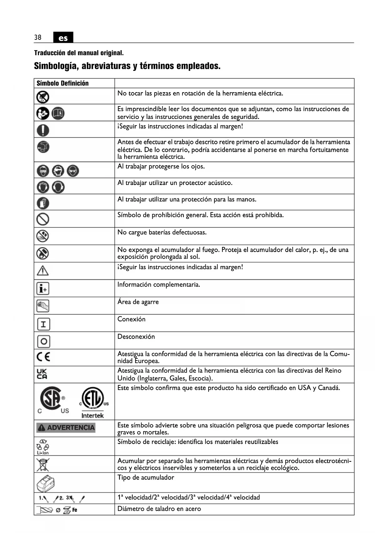 Traducción del manual original. Simbología, abreviaturas y términos empleados. Símbolo Definición No tocar las piezas en rotación de la herramienta eléctrica. Es imprescindible leer los documentos que se adjuntan, como las instrucciones de servicio y las instrucciones generales de seguridad. ¡Seguir las instrucciones indicadas al margen! Antes de efectuar el trabajo descrito retire primero el acumulador de la herramienta eléctrica. De lo contrario, podría accidentarse al ponerse en marcha fortuitamente la herramienta eléctrica. Al trabajar protegerse los ojos. Al trabajar utilizar un protector acústico. Al trabajar utilizar una protección para las manos. Símbolo de prohibición general. Esta acción está prohibida. No cargue baterías defectuosas. No exponga el acumulador al fuego. Proteja el acumulador del calor, p. ej., de una exposición prolongada al sol. ¡Seguir las instrucciones indicadas al margen! Información complementaria. Área de agarre Conexión Desconexión Atestigua la conformidad de la herramienta eléctrica con las directivas de la Comu- nidad Europea. Atestigua la conformidad de la herramienta eléctrica con las directivas del Reino Unido (Inglaterra, Gales, Escocia). Este símbolo confirma que este producto ha sido certificado en USA y Canadá. Este símbolo advierte sobre una situación peligrosa que puede comportar lesiones graves o mortales. Símbolo de reciclaje: identifica los materiales reutilizables Acumular por separado las herramientas eléctricas y demás productos electrotécni- cos y eléctricos inservibles y someterlos a un reciclaje ecológico. Tipo de acumulador 1ª velocidad/2ª velocidad/3ª velocidad/4ª velocidad Diámetro de taladro en acero ADVERTENCIA
