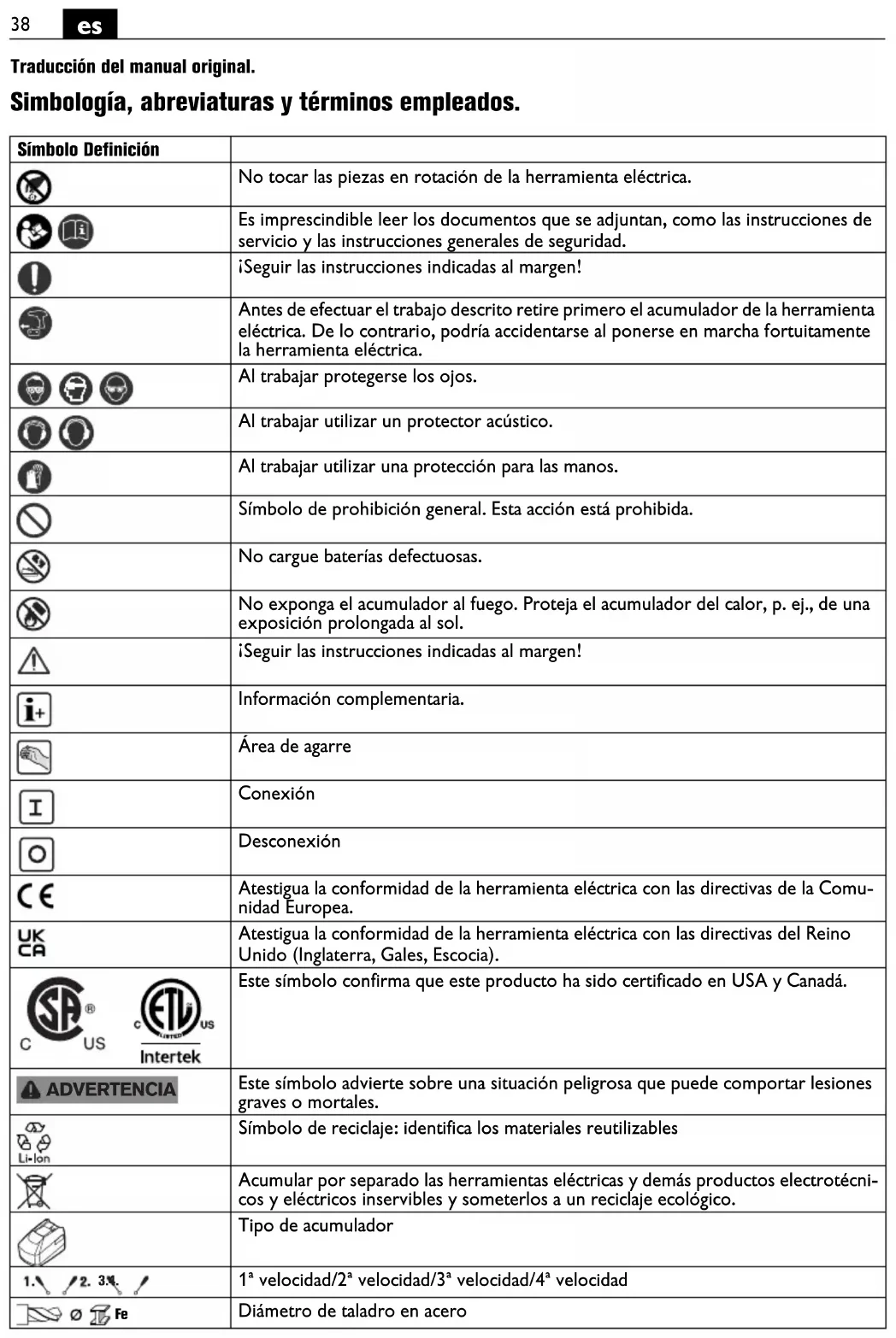 Traducción del manual original. Simbología, abreviaturas y términos empleados. Símbolo Definición No tocar las piezas en rotación de la herramienta eléctrica. Es imprescindible leer los documentos que se adjuntan, como las instrucciones de servicio y las instrucciones generales de seguridad. ¡Seguir las instrucciones indicadas al margen! Antes de efectuar el trabajo descrito retire primero el acumulador de la herramienta eléctrica. De lo contrario, podría accidentarse al ponerse en marcha fortuitamente la herramienta eléctrica. Al trabajar protegerse los ojos. Al trabajar utilizar un protector acústico. Al trabajar utilizar una protección para las manos. Símbolo de prohibición general. Esta acción está prohibida. No cargue baterías defectuosas. No exponga el acumulador al fuego. Proteja el acumulador del calor, p. ej., de una exposición prolongada al sol. ¡Seguir las instrucciones indicadas al margen! Información complementaria. Área de agarre Conexión Desconexión Atestigua la conformidad de la herramienta eléctrica con las directivas de la Comu- nidad Europea. Atestigua la conformidad de la herramienta eléctrica con las directivas del Reino Unido (Inglaterra, Gales, Escocia). Este símbolo confirma que este producto ha sido certificado en USA y Canadá. Este símbolo advierte sobre una situación peligrosa que puede comportar lesiones graves o mortales. Símbolo de reciclaje: identifica los materiales reutilizables Acumular por separado las herramientas eléctricas y demás productos electrotécni- cos y eléctricos inservibles y someterlos a un reciclaje ecológico. Tipo de acumulador 1ª velocidad/2ª velocidad/3ª velocidad/4ª velocidad Diámetro de taladro en acero ADVERTENCIA