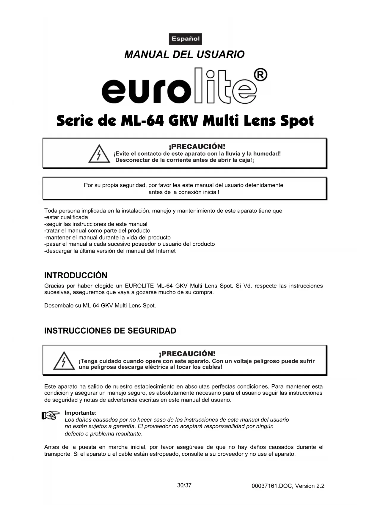 Gracias por haber elegido un EUROLITE ML-64 GKV Multi Lens Spot. Si Vd. respects las instrucciones suscesivas, aseguremos que vaya a gozarse多么 de su compra.