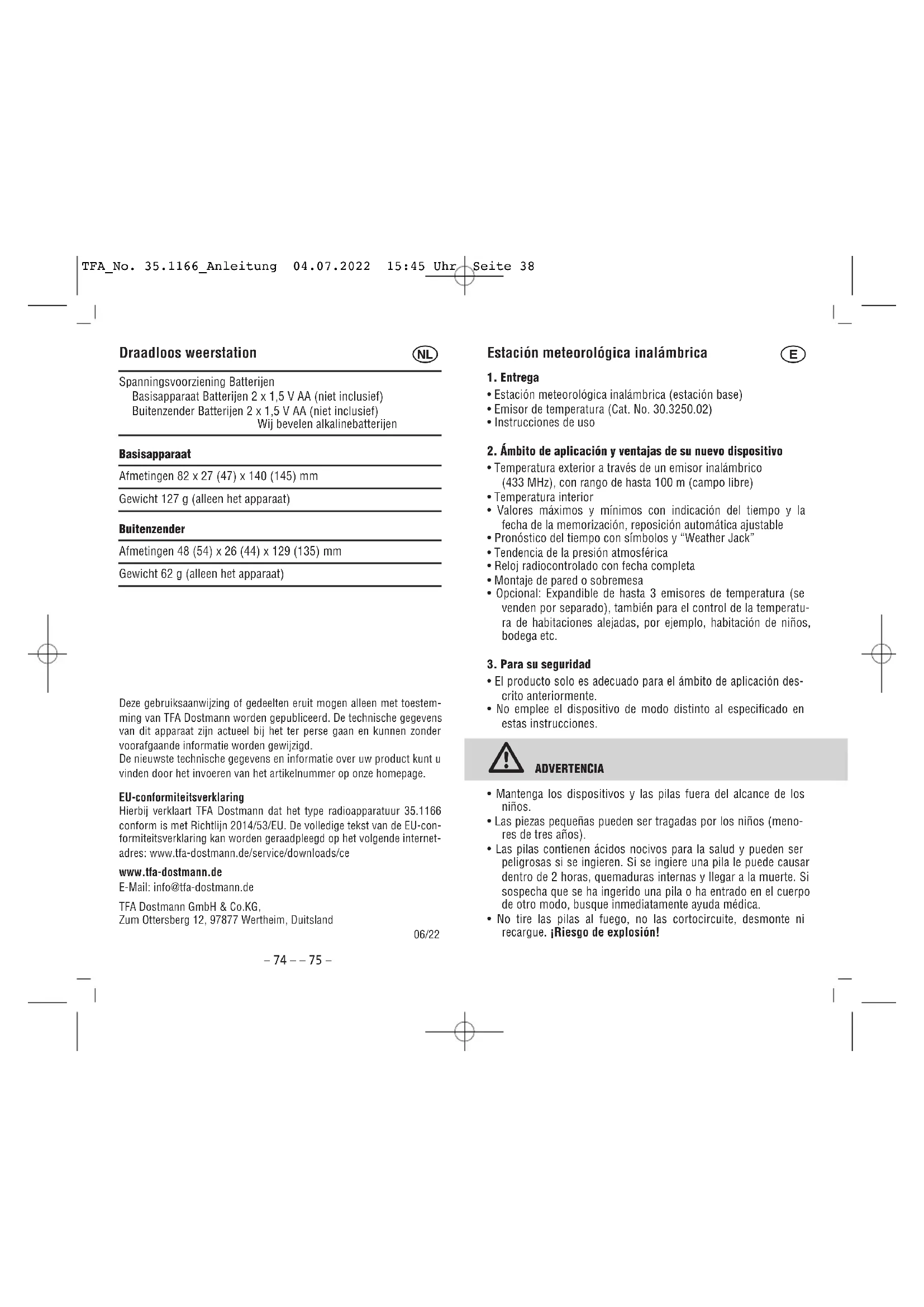 Por la presente, TFA Dostmann declares que el tipo de equipo radioelec- trico 35.1166 es conforme con la Directiva 2014/53/UE. El texto completo de la declaracion UE de conformidad está disponible en la direc- cion Internet seguiente: www.tfa-dostmann.de/service/downloads/ce