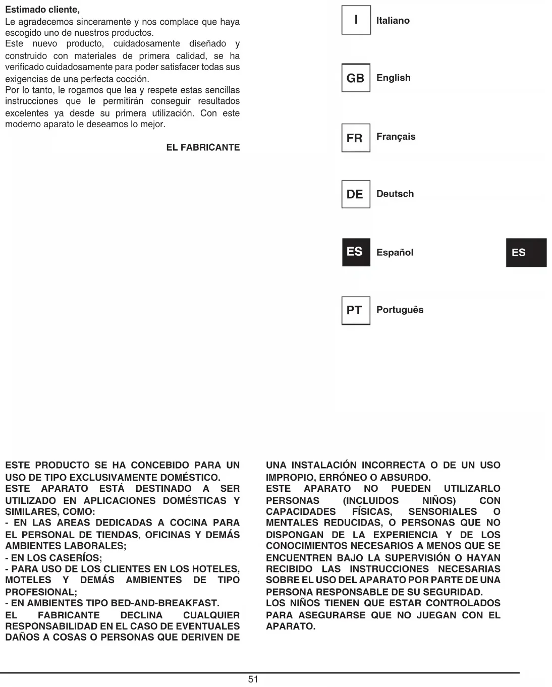 SOBRE EL USO DEL APARATO POR PARTE DE UNA PERSONA RESPONSABLE DE SU SEGURIDAD. LOS NIÑOS TIENEN QUE ESTAR CONTROLADOS PARA ASEGURARSE QUE NO JUEGAN CON EL APARATO. Estimado cliente, Le agradecemos sinceramente y nos complace que haya escogido uno de nuestros productos. Este nuevo producto, cuidadosamente diseñado y construido con materiales de primera calidad, se ha verificado cuidadosamente para poder satisfacer todas sus exigencias de una perfecta cocción. Por lo tanto, le rogamos que lea y respete estas sencillas instrucciones que le permitirán conseguir resultados excelentes ya desde su primera utilización. Con este moderno aparato le deseamos lo mejor. EL FABRICANTE Italiano