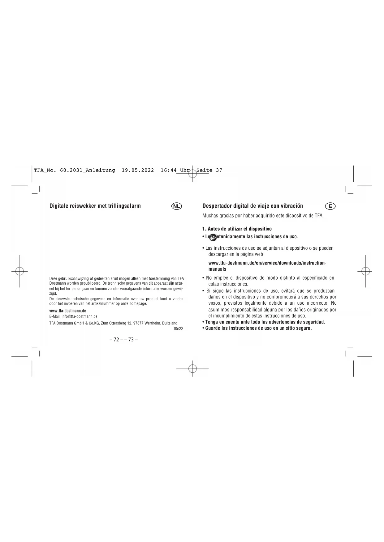 - Guarde las instrucciones de uso en un sitio seguro. TFA_No. 60.2031_Anleitung 19.05.2022 16:44 Uhr Seite 37– 74 – – 75 – Despertador digital de viaje con vibración